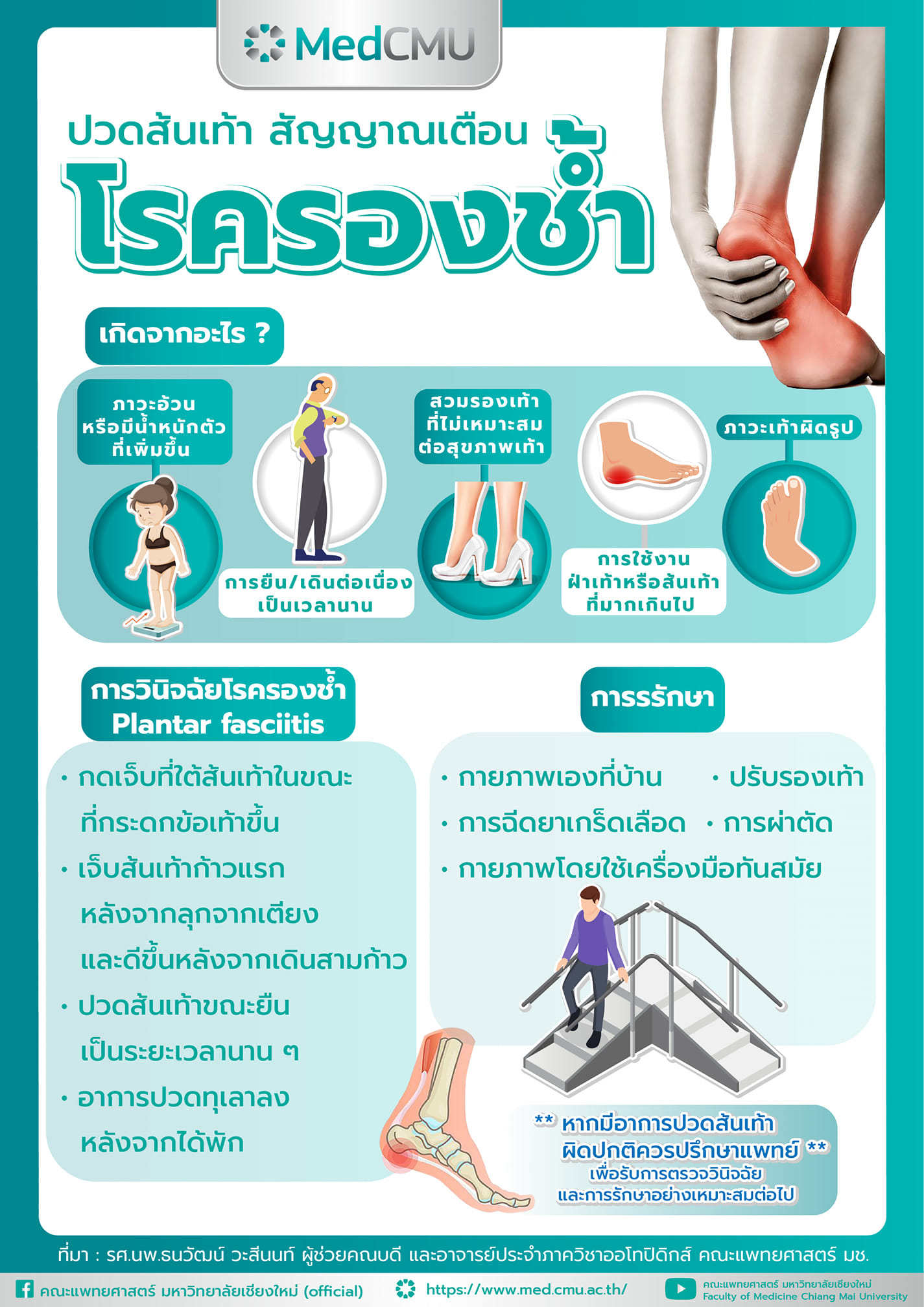 รศ.นพ.ธนวัฒน์ วะสีนนท์ อาจารย์ประจำหน่วยเท้าและข้อเท้า ภาควิชาออโทปิดิกส์ คณะแพทยศาสตร์ มช. กล่าวว่า “โรครองช้ำหรือโรคที่เกิดจากการบาดเจ็บของเส้นเอ็นฝ่าเท้า ลักษณะอาการจะปวดรุนแรงที่สุดเมื่อเริ่มมีการลงน้ำหนักที่ส้นเท้าในก้าวแรก เช่น เมื่อลุกเดินก้าวแรกหลังตื่นนอน และดีขึ้นหลังจากเดินสามก้าว หรือกดเจ็บที่ใต้ส้นเท้า ในขณะที่กระดกข้อเท้าขึ้น นอกจากนี้ อาจมีอาการปวดมากขึ้นได้ในช่วงระหว่างวันหรือหลังจากที่เท้าต้องรับน้ำหนักเป็นเวลานาน เช่น ยืนหรือเดินเป็นเวลานาน และเมื่อมีการเคลื่อนไหวมากขึ้นก็จะยิ่งมีอาการปวดมากขึ้น แม้จะดูเหมือนโรคนี้ไม่อันตรายร้ายแรง แต่ก็ไม่ควรปล่อยทิ้งไว้โดยไม่ทำการรักษา เพราะอาจส่งผลกระทบต่อการทำกิจวัตรประจำวันได้