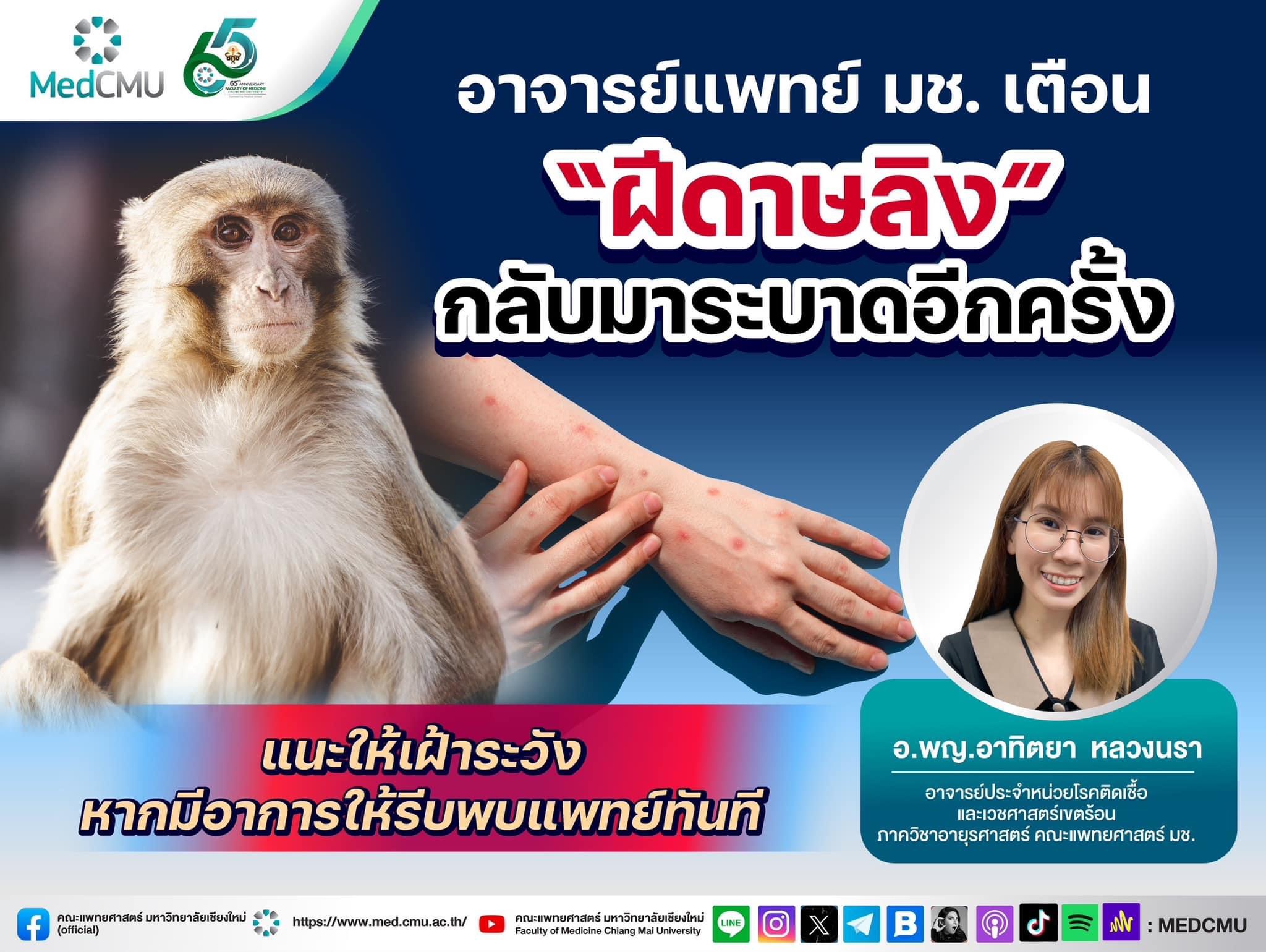 อาจารย์แพทย์ คณะแพทยศาสตร์ มช. เตือนประชาชน จับตากระแสโรคฝีดาษลิง หวั่นแพร่ระบาดแนะให้เฝ้าระวังสังเกตอาการ ผู้ป่วยส่วนใหญ่มักมีอาการไม่รุนแรง แต่หากผู้ป่วยที่มีภาวะภูมิคุ้มกันบกพร่องสามารถมีการดำเนินโรคที่รุนแรงได้ หากมีอาการให้รีบพบแพทย์ทันที