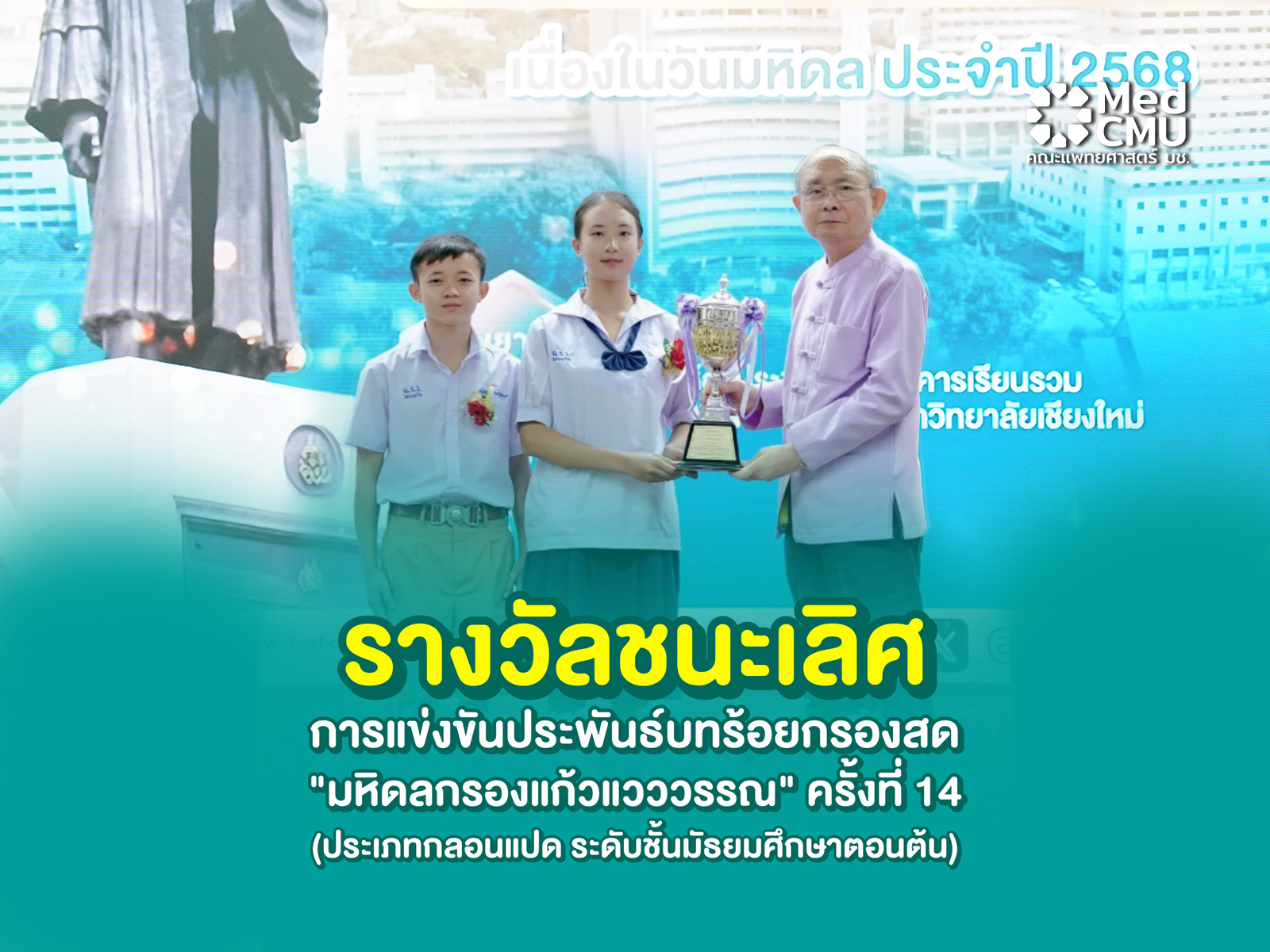 🏆รางวัลชนะเลิศ การแข่งขันประพันธ์บทร้อยกรองสด “มหิดลกรองแก้วแวววรรณ” ครั้งที่ 14 (ประเภทกลอนแปด ระดับชั้นมัธยมศึกษาตอนต้น)
