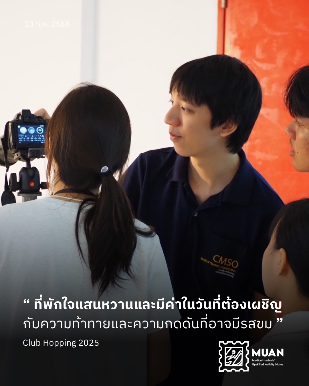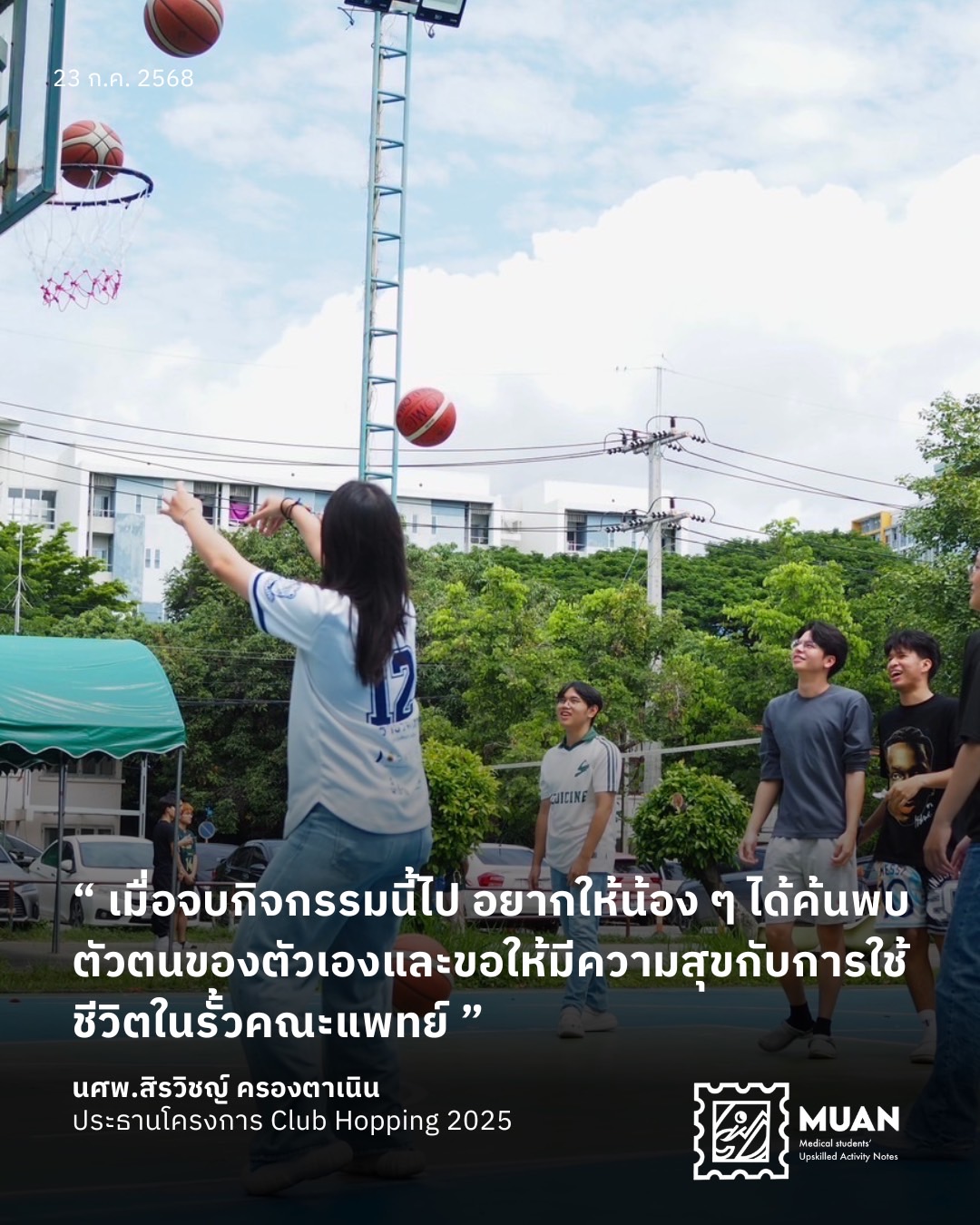 “…การเข้ามาเรียนคณะแพทย์ก็เหมือนเป็นการเริ่มต้นเส้นทางชีวิตใหม่ อยากให้น้อง ๆ ได้เปิดโอกาสให้ตนเองได้ค้นพบสิ่งใหม่ ๆ รวมถึงตัวตนด้านอื่นที่อาจไม่เคยเห็นมาก่อน และเมื่อจบกิจกรรมนี้ไปก็อยากให้น้อง ๆ ได้ค้นพบตัวตนของตัวเองและขอให้มีความสุขกับการใช้ชีวิตในรั้วคณะแพทย์…”-นศพ.สิรวิชญ์ ครองตาเนิน ประธานโครงการ Club Hopping 2568