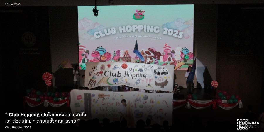 และสำหรับน้องใหม่ที่เพิ่งก้าวเข้าสู่รั้วแพทย์เชียงใหม่ก็ได้เปิดโลกแห่งความสนใจไปกับกิจกรรม “Club Hopping” ซึ่งเปิดโอกาสให้นักศึกษาแพทย์ได้ทำความรู้จักกับเพื่อน ๆ และพี่ ๆ ผู้ที่มีความสนใจในสิ่งเดียวกัน หรืออาจค้นพบตัวตนใหม่ที่ไม่เคยได้สัมผัสในดินแดนลูกกวาดหลากรสมากสีสันนี้