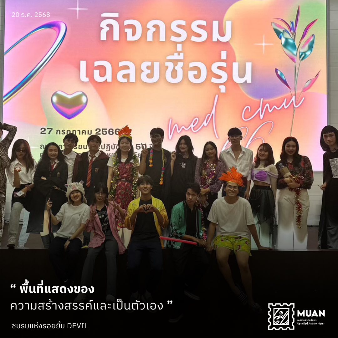 หากเราพูดถึง “สีสันแห่งสันทนาการ” ของคณะแพทยศาสตร์ มหาวิทยาลัยเชียงใหม่ คงไม่มีใครไม่รู้จัก DEVIL ซึ่งย่อมาจาก Division of Entertainment, Vitality and Interactive Leadership ชื่อที่ฟังดูดุร้ายเหมือนปีศาจ แต่กลับสะท้อนตัวตนของทีมนี้ได้อย่างลงตัว เพราะ DEVIL คือเหล่านักศึกษาแพทย์ที่เต็มไปด้วยพลัง ความคิดสร้างสรรค์ และความสดใหม่แบบไม่หมดไฟง่าย ๆ ไม่ว่าจะเป็นงานไหน กิจกรรมอะไร หรือบรรยากาศชวนเครียดแค่ไหน DEVIL ก็จะเข้ามาช่วยใส่สี เติมเสียง และสร้างชีวิตชีวา ให้ทุกกิจกรรมของคณะแพทย์เป็นพื้นที่แห่งความบันเทิงเสมอ