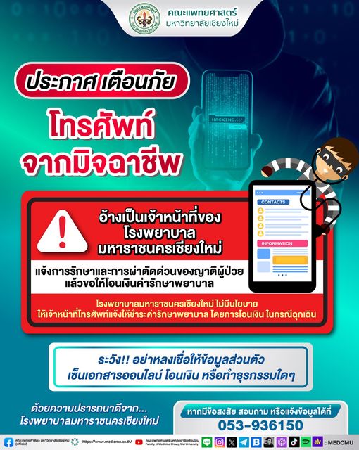 โรงพยาบาลมหาราชนครเชียงใหม่ ไม่มีนโยบาย ให้เจ้าหน้าที่โทรศัพท์แจ้งให้ชำระค่ารักษาพยาบาล โดยการโอนเงิน ในกรณีฉุกเฉิน