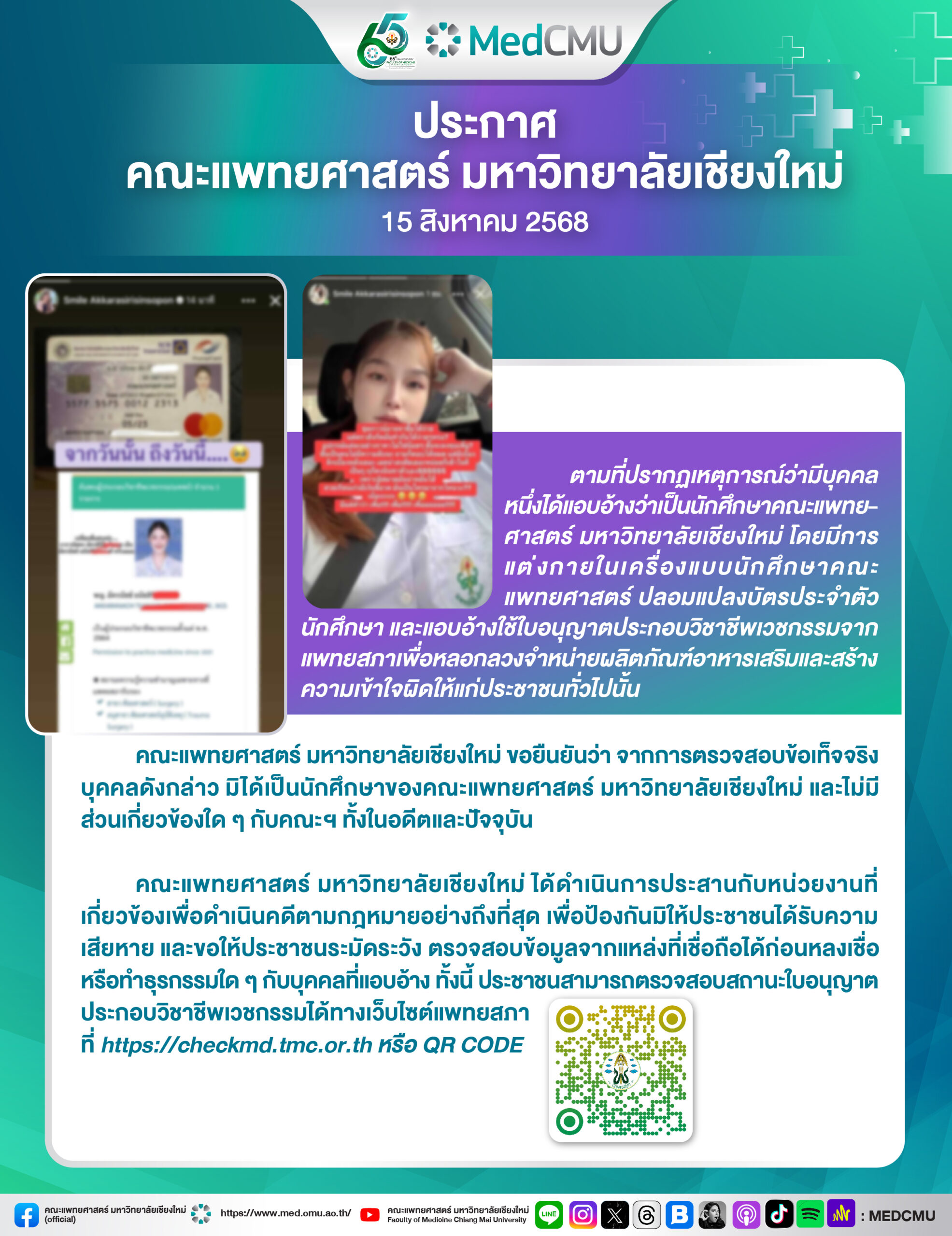 คณะแพทยศาสตร์ มหาวิทยาลัยเชียงใหม่ ขอยืนยันว่า จากการตรวจสอบข้อเท็จจริง บุคคลดังกล่าว มิได้เป็นนักศึกษาของคณะแพทยศาสตร์ มหาวิทยาลัยเชียงใหม่ และไม่มีส่วนเกี่ยวข้องใด ๆ กับคณะฯ ทั้งในอดีตและปัจจุบัน