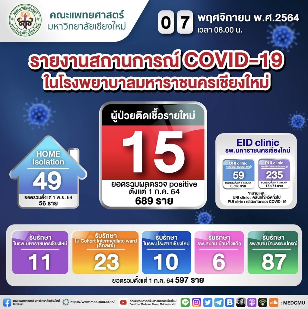 สถานการณ์ผู้ป่วย COVID-19 ในความดูแลของคณะแพทยศาสตร์ มหาวิทยาลัยเชียงใหม่ วันที่ 7 พย. 2564 : 08:00 น.