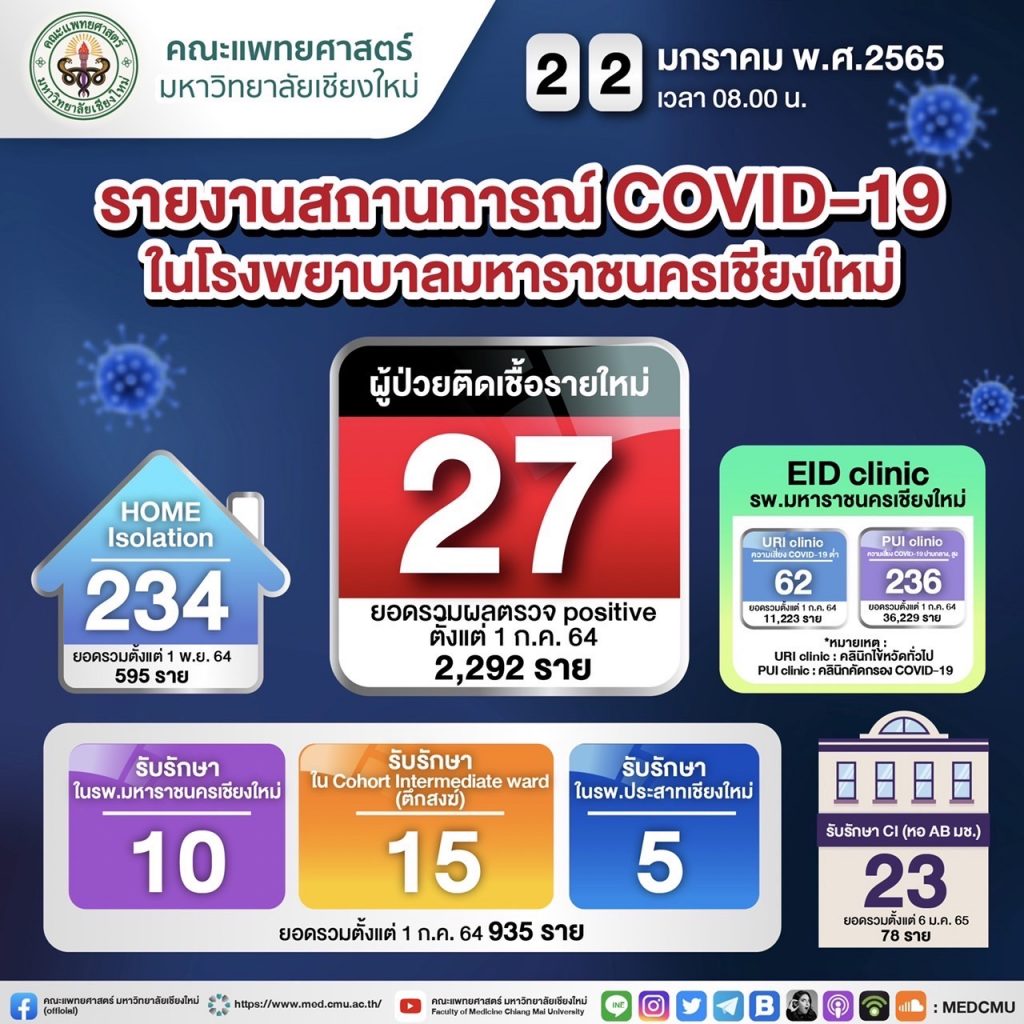 สถานการณ์ผู้ป่วย COVID-19 ในความดูแลของคณะแพทยศาสตร์ มหาวิทยาลัยเชียงใหม่ วันที่ 22 ม.ค. 2565 : 08:00 น.