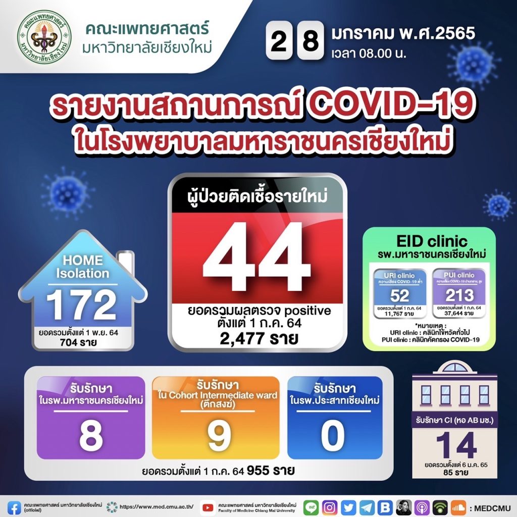 สถานการณ์ผู้ป่วย COVID-19 ในความดูแลของคณะแพทยศาสตร์ มหาวิทยาลัยเชียงใหม่ วันที่ 28 ม.ค. 2565 : 08:00 น.