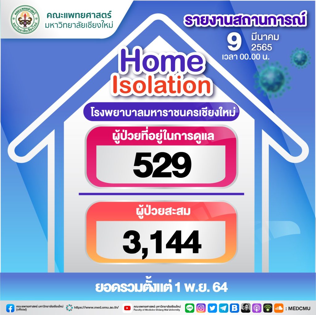 สถานการณ์ผู้ป่วย Home Isolation ในความดูแลของคณะแพทยศาสตร์ มหาวิทยาลัยเชียงใหม่ วันที่ 9 มี.ค. 2565 : 08:00 น.
