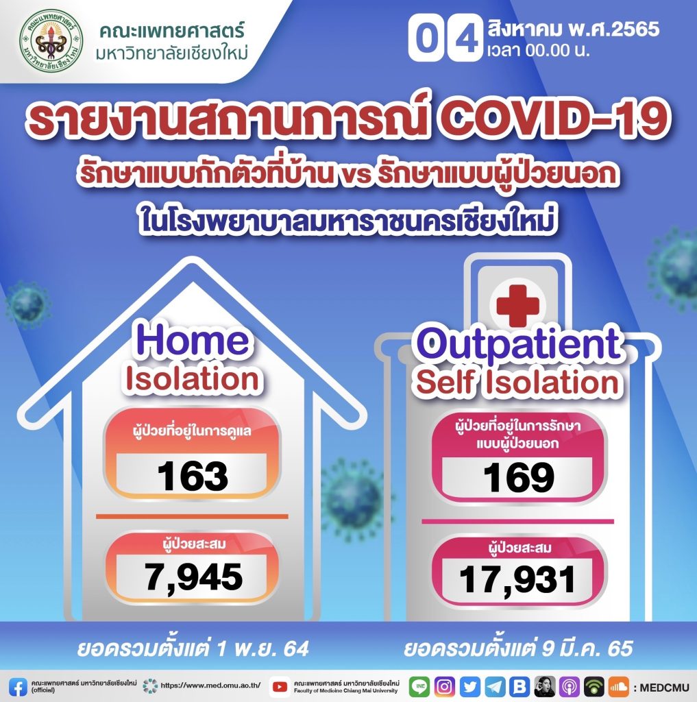 สถานการณ์ผู้ป่วย COVID-19 ในความดูแลของคณะแพทยศาสตร์ มหาวิทยาลัยเชียงใหม่ วันที่ 4 ส.ค. 2565 : 00:00 น.