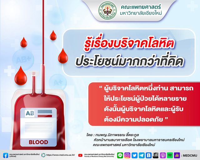 โลหิตบริจาคทุกถุงจะถูกนำไปเตรียมเป็นส่วนประกอบของโลหิตชนิดต่างๆ เพื่อนำมาใช้ในการรักษาพยาบาลผู้ป่วย โดยเฉพาะอย่างยิ่งการผ่าตัดหัวใจทุกวันทั้งในผู้ป่วยเด็กและผู้ใหญ่ นอกจากนี้คณะแพทยศาสตร์ มหาวิทยาลัยเชียงใหม่ ยังเป็นศูนย์การรักษาเฉพาะทางด้านการปลูกถ่ายอวัยวะ เช่น การปลูกถ่ายไต ปลูกถ่ายตับ และการปลูกถ่ายเซลล์ต้นกำเนิดเม็ดโลหิต จึงมีความต้องการใช้โลหิตและส่วนประกอบของโลหิตในแต่ละวันในปริมาณที่ค่อนข้างมาก และที่สำคัญในปัจจุบันการจราจรตามท้องถนนมีความคับคั่งจึงมีโอกาสที่จะเกิดอุบัติเหตุฉุกเฉินได้ตลอดเวลา