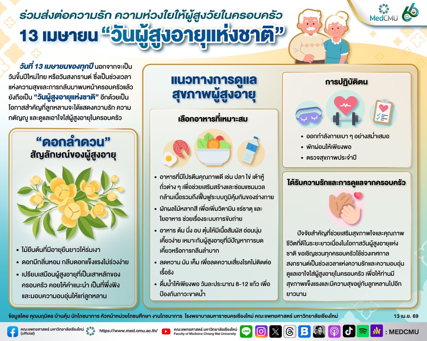 ในโอกาส วันผู้สูงอายุแห่งชาติ คณะแพทยศาสตร์ มหาวิทยาลัยเชียงใหม่ ขอร่วมส่งต่อความห่วงใย พร้อมแนะนำแนวทางการดูแลสุขภาพผู้สูงอายุ เพื่อให้ผู้สูงวัยมีคุณภาพชีวิตที่ดี แข็งแรง และมีความสุขไปพร้อมกับครอบครัว