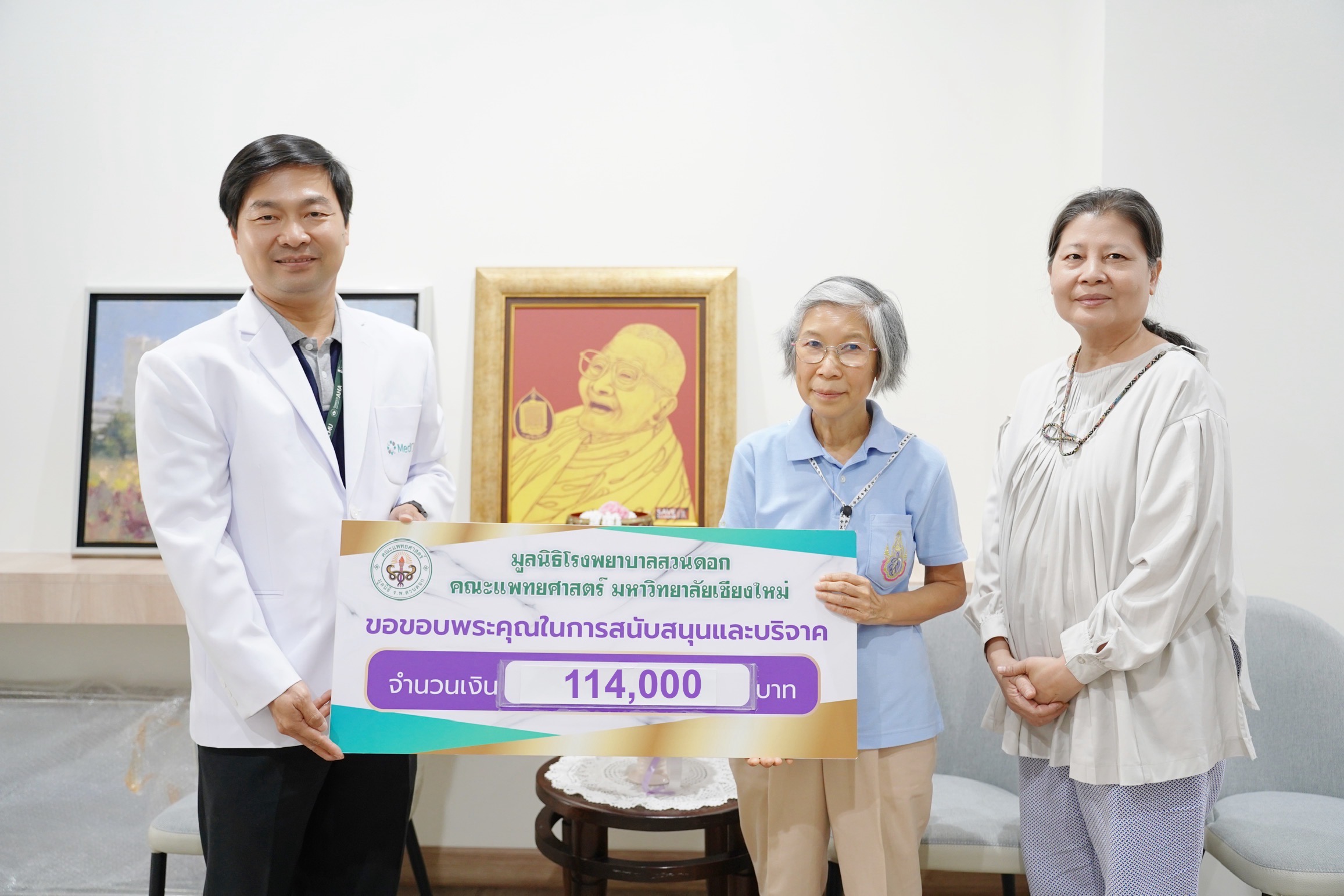 ผศ.นพ.สิทธิชา สิริอารีย์ รองผู้อำนวยการโรงพยาบาลมหาราชนครเชียงใหม่ รับมอบเงินบริจาค จำนวน 114,000 บาท จากคุณนงเยาว์ มาลัยทอง พร้อมคณะ โดยสมทบทุนมูลนิธิโรงพยาบาลสวนดอก เพื่อปรับปรุงห้องอัลตร้าซาวน์ หน่วยเวชศาสตร์มารดาและทารก จำนวน 64,000 บาท และสมทบทุนมูลนิธิโรงพยาบาลสวนดอก เพื่อพระภิกษุสงฆ์อาพาธ จำนวน 50,000 บาท ในวันที่ 27 มีนาคม 2567 ณ ห้องรับรอง ชั้น 1 อาคารศรีพัฒน์ คณะแพทยศาสตร์ มช.