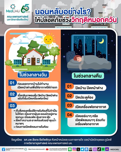 ควรปิดบ้าน ปิดหน้าต่าง ปิดประตูห้อง แล้วเปิดเครื่องฟอกอากาศ เปิดแอร์เบาๆ หากไม่เปิดแอร์เลยแล้วปิดบ้านปิดหน้าต่างหมด ความชื้นจากเหงื่อจะทำให้เรารู้สึกไม่สบายตัว รู้สึกอึดอัด การเปิดแอร์ 25 องศาเซลเซียส จะช่วยจัดการกับความชื้นของเหงื่อในอากาศ ขณะเดียวกันเครื่องฟอกอากาศก็จะกำจัดฝุ่นควัน PM 2.5 ภายในห้องไปด้วย จะทำให้เราหลับสบายเพราะอากาศภายในห้องถ่ายเทดี ในช่วงเช้าก่อนออกจากบ้านไปทำงานจึงค่อยเปิดหน้าต่างเพื่อให้อากาศได้ถ่ายเท และเมื่อกลับมาตอนเย็นจึงปิดบ้านปิดหน้าต่างแล้วก็เริ่มเปิดเครื่องฟอกกันใหม่