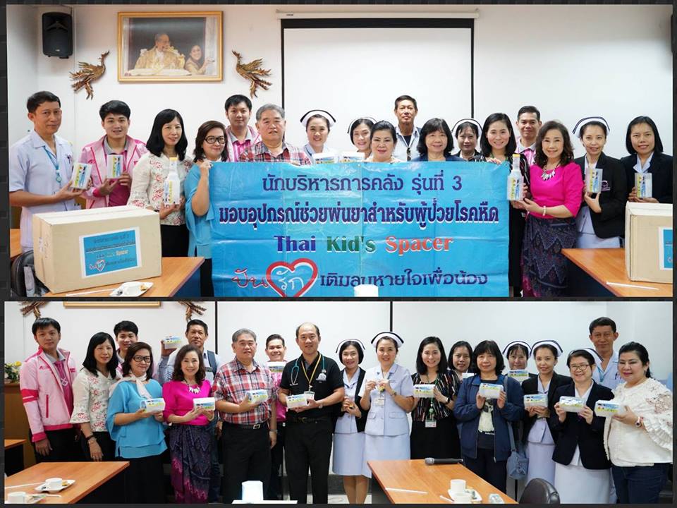 ชมรมนักบริหารการคลัง รุ่น 3 (นคบ.3) มอบอุปกรณ์ช่วยพ่นยาสำหรับผู้ป่วยโรคหอบหืด Thai Kid’s Spacer จำนวน 100 ชุด ให้แก่งานการพยาบาลผู้ป่วยกุมารเวชศาสตร์ ฝ่ายการพยาบาล โรงพยาบาลมหาราชนครเชียงใหม่ โดยมี อ.นพ.สนิท เรืองรองรัตน์ หัวหน้าสาขาวิชาระบบหายใจ ภาควิชากุมารเวชศาสตร์ คณะแพทยศาสตร์ มช. และ คุณสุคนทา คุณาพันธ์ หัวหน้างานการพยาบาลผู้ป่วยกุมารเวชศาสตร์ฯ รับมอบ เมื่อวันที่ 18 มกราคม 2561 ณ ห้องประชุมงานการพยาบาลผู้ป่วยกุมารเวชศาสตร์ ชั้น 6 อาคารบุญสม มาร์ติน คณะแพทยศาสตร์ มช.