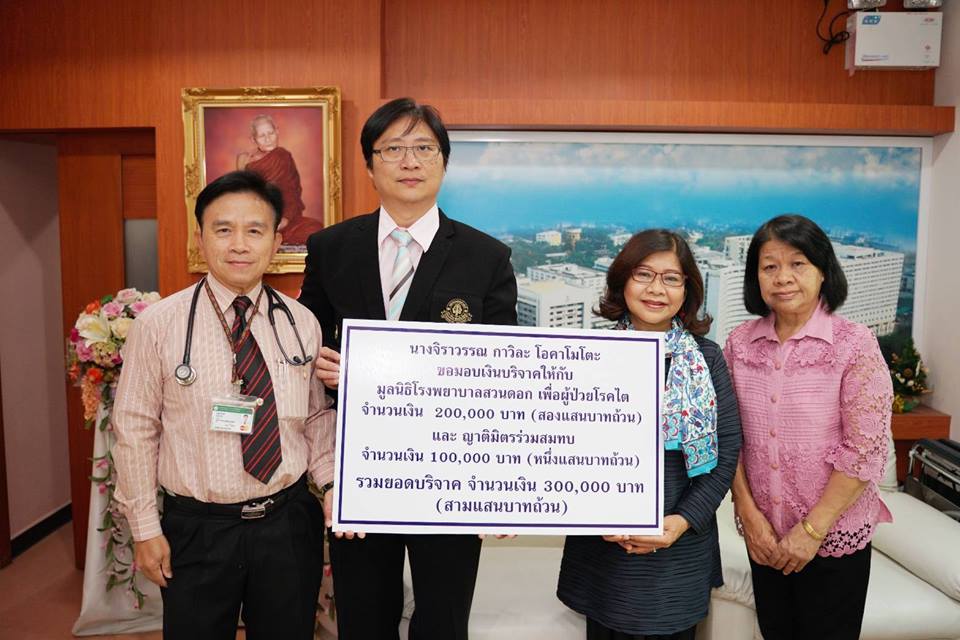 คุณจิราวรรณ กาวิละ โอคาโมโตะ และญาติมิตร มอบเงินบริจาคสมทบทุนมูลนิธิโรงพยาบาลสวนดอก เพื่อผู้ป่วยโรคไต จำนวน 300,000บาท โดยมี ผศ.นพ.จารึก หาญประเสริฐพงษ์ ผู้ช่วยคณบดี และ อ.นพ.ดิเรก บรรณจักร์ หัวหน้าหน่วยโรคไต ภาควิชาอายุรศาสตร์ คณะแพทยศาสตร์ มช. รับมอบ เมื่อวันที่ 20 กุมภาพันธ์ 2562 ณ ห้องรับรองงานประชาสัมพันธ์ ชั้น 1 อาคารเฉลิมพระบารมี คณะแพทยศาสตร์ มช. 0 401