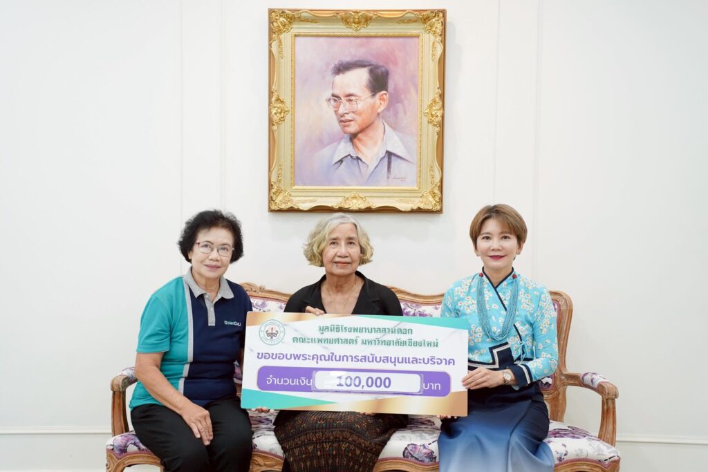 ผศ.พญ.พุดตาน วงศ์ตรีรัตนชัย รองคณบดีด้านสื่อสารองค์กร คณะแพทยศาสตร์ มหาวิทยาลัยเชียงใหม่ รับมอบเงินบริจาค จำนวน 100,000 บาท จากคุณนิศา ฮือบึล สมทบทุนมูลนิธิโรงพยาบาลสวนดอก เพื่อจัดซื้อเครื่องเลเซอร์สำหรับผ่าตัด หู คอ จมูก และกล่องเสียง