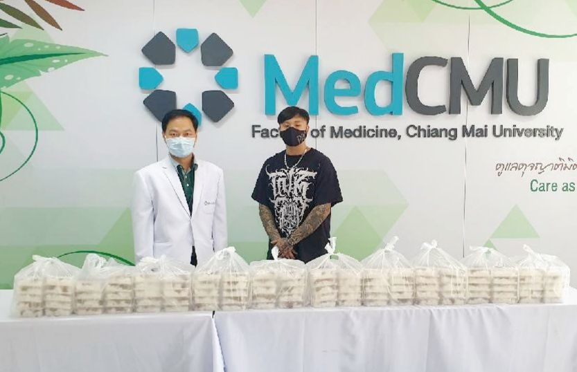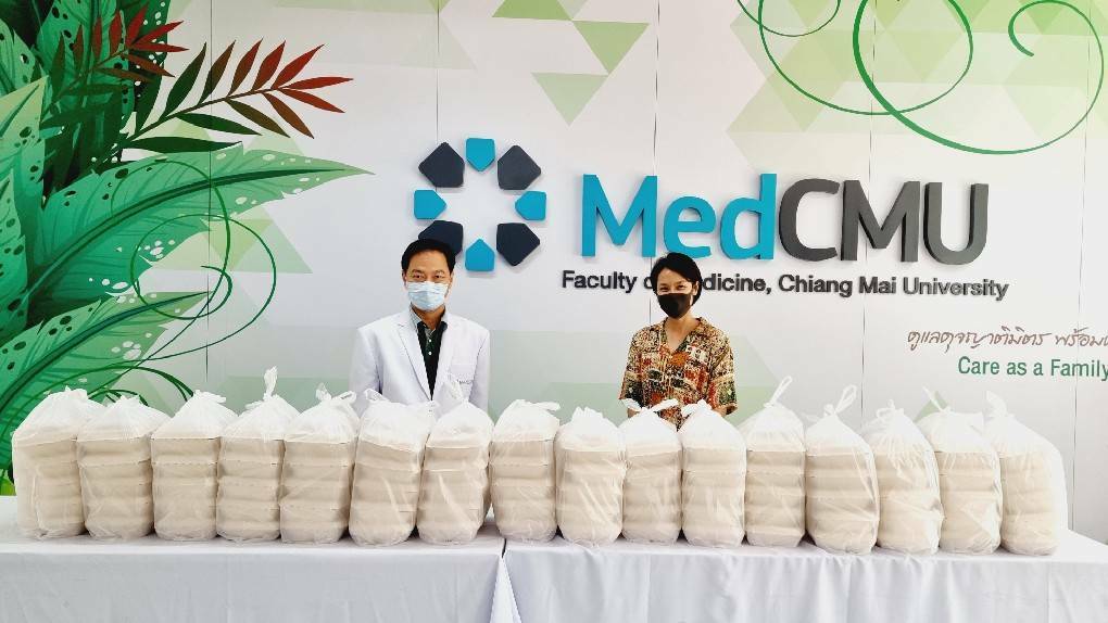 ผศ.นพ.สิทธิชา สิริอารีย์ รองผู้อำนวยการโรงพยาบาลมหาราชนครเชียงใหม่ รับมอบขนมจีนน้ำยา จำนวน 160 ชุด จาก ร้านบุฟเฟ่ต์ขนมจีนวัดเกต และคุณปัญจรัศน์ ปวรฉัตท์ธนัท ที่บริจาคให้แก่ทีมแพทย์ พยาบาล และบุคลากรที่ปฏิบัติหน้าที่ในสถานการณ์โควิด-19 ของโรงพยาบาลมหาราชนครเชียงใหม่ คณะแพทยศาสตร์ มช. เมื่อวันที่ 13 กรกฎาคม 2564 ณ บริเวณโถงชั้น 1 อาคารบุญสม มาร์ติน คณะแพทยศาสตร์ มช.