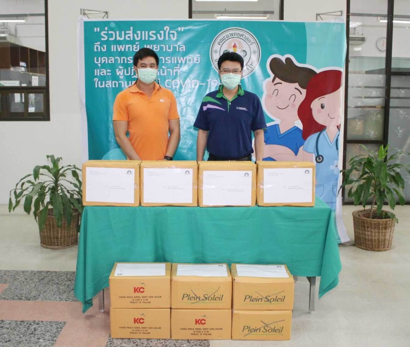 รศ.นพ.ชัยวัฒน์ บำรุงกิจ รองคณบดีคณะแพทยศาสตร์ มช. รับมอบ ข้าวโพดหวานบรรจุกระป๋องพร้อมรับประทาน จำนวน 1,200 กระป๋อง จากบริษัท ซันสวีท จำกัด (มหาชน) ที่มอบให้แก่ทีมแพทย์ พยาบาล และบุคลากรที่ปฏิบัติหน้าที่ในสถานการณ์โควิด-19 ของโรงพยาบาลมหาราชนครเชียงใหม่ คณะแพทยศาสตร์ มช. เมื่อวันที่ 13 กรกฎาคม 2564 ณ บริเวณโถงชั้น 1 อาคารราชนครินทร์ คณะแพทยศาสตร์ มช.