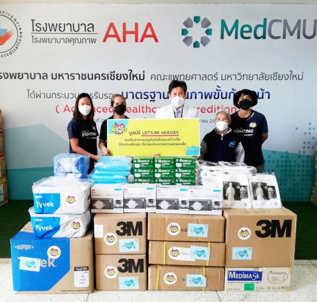 รศ.นพ.ณัฐพงศ์ โฆษชุณหนันท์ รองคณบดีคณะแพทยศาสตร์ มช. รับมอบชุด PPE จำนวน 170 ชุด, หน้ากากอนามัย จำนวน 40 กล่อง, หน้ากาก N95 จำนวน 400 ชิ้น, ถุงคลุมเท้า จำนวน 200 คู่ และชุด CPE จำนวน 480 ชุด จาก มูลนิธิ Let’s be Heroes ที่มอบให้แก่ทีมแพทย์ พยาบาล และบุคลากรที่ปฏิบัติหน้าที่ในสถานการณ์โควิด-19 ของโรงพยาบาลมหาราชนครเชียงใหม่ คณะแพทยศาสตร์ มช. เมื่อวันที่ 2 พฤศจิกายน 2564 ณ บริเวณโถงชั้น 1 อาคารบุญสม มาร์ติน คณะแพทยศาสตร์ มช.