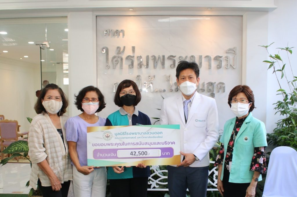รศ.นพ.ณัฐพงศ์ โฆษชุณหนันท์ รองคณบดีคณะแพทยศาสตร์ มช. รับมอบเงินบริจาคจำนวน 42,500 บาท จากพยาบาลรุ่น 13 (SN 13) มหาวิทยาลัยเชียงใหม่ สมทบทุนมูลนิธิโรงพยาบาลสวนดอก เพื่อจัดซื้อเครื่องผลิตออกซิเจนสำหรับผู้ป่วยไวรัสโควิด-19 เมื่อวันที่ 2 พฤศจิกายน 2564 ณ ศาลาใต้ร่มพระบารมี ชั้น 1 อาคารสุจิณโณ คณะแพทยศาสตร์ มช.