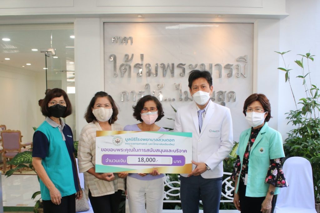 รศ.นพ.ณัฐพงศ์ โฆษชุณหนันท์ รองคณบดีคณะแพทยศาสตร์ มช. รับมอบเงินบริจาคจำนวน 18,000 บาท จากตัวแทนคุณศศิภาพรรณ คมสัตย์ธรรม สมทบทุนมูลนิธิโรงพยาบาลสวนดอก เพื่อจัดซื้อเครื่องผลิตออกซิเจนสำหรับผู้ป่วยไวรัสโควิด-19 เมื่อวันที่ 2 พฤศจิกายน 2564 ณ ศาลาใต้ร่มพระบารมี ชั้น 1 อาคารสุจิณโณ คณะแพทยศาสตร์ มช.