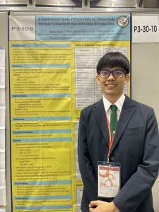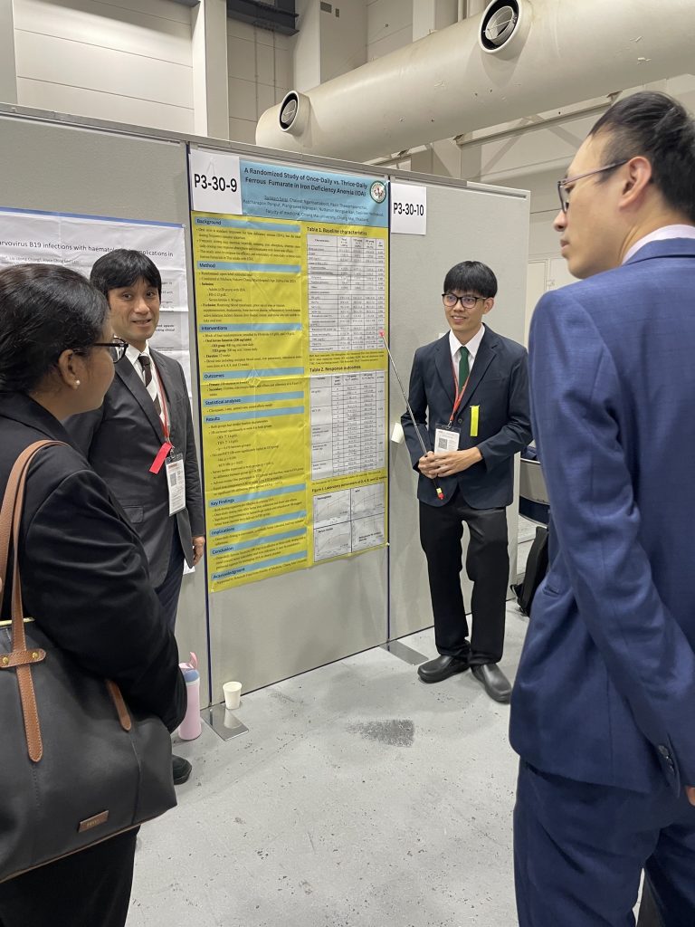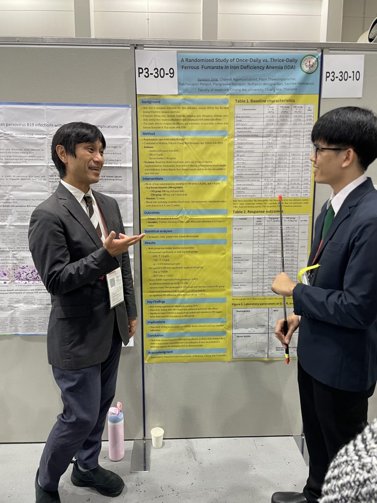 นักศึกษาแพทย์ชั้นปีที่ 5 คณะแพทยศาสตร์ มหาวิทยาลัยเชียงใหม่ ได้แก่ นศพ.สุพศิน สาใจ เป็นตัวแทนนำเสนอผลงานวิจัยในรูปแบบ Poster (Poster Presentation) เรื่อง “A Randomized Study of Once-Daily vs. Thrice-Daily Ferrous Fumarate in Iron Deficiency Anemia (IDA)“ ซึ่งเป็นการศึกษาถึงประสิทธิภาพในการให้ยาธาตุเหล็ก เปรียบเทียบระหว่างวันละ 1 ครั้ง กับ 3 ครั้ง ในผู้ป่วยโลหิตจาง