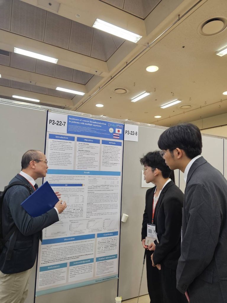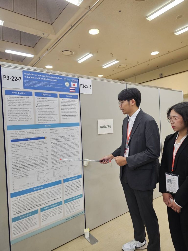 การนำเสนอผลงานครั้งนี้จัดขึ้นในงานประชุมวิชาการระดับนานาชาติ The 87th Annual Meeting of the Japanese Society of Hematology ระหว่างวันที่ 10-12 ตุลาคม 2568 ณ เมืองโกเบ ประเทศญี่ปุ่น โดยมีทีมผู้ร่วมวิจัยประกอบด้วย นศพ.อัสวณี จุฬาธรรมกุล, นศพ.ฐณิชา โมราสุข, นศพ.ศรัณวิชญ์ จันทรมิล และ นศพ.อานุภาพ แสงจันทร์ ภายใต้การดูแลของ รศ.ดร.นพ.ชาตรี ชัยอดิศักดิ์โสภา หน่วยโลหิตวิทยา ภาควิชาอายุรศาสตร์ คณะแพทยศาสตร์ มหาวิทยาลัยเชียงใหม่