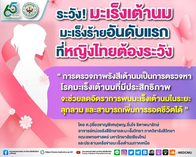 ขอขอบคุณข้อมูลจาก: ศ.(เชี่ยวชาญพิเศษ)พญ.อิ่มใจ ชิตาพนารักษ์ อาจารย์หน่วยรังสีรักษาเเละมะเร็งวิทยา ภาควิชารังสีวิทยา คณะแพทยศาสตร์ มช. และ ประธานเครือข่ายมะเร็งเต้านมภาคเหนือ