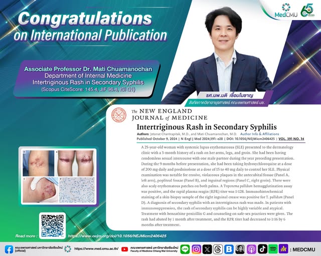 āļĢāļāļāļĻāļēāļŠāļāļĢāļēāļāļēāļĢāļĒāđ āļāļēāļĒāđāļāļāļĒāđ āļĄāļāļī āđāļāļ·āđāļāđāļāļāļēāļ āļāļēāļāļēāļĢāļĒāđāļāļĢāļ°āļāļģāļ āļēāļāļ§āļīāļāļēāļāļēāļĒāļļāļĢāļĻāļēāļŠāļāļĢāđ āđāļĨāļ°āļāļāļ°āļāļđāđāļ§āļīāļāļąāļĒ āđāļāđāļāļĩāļāļīāļĄāļāđāļāļĨāļāļēāļāļ§āļīāļāļąāļĒāđāļāļ§āļēāļĢāļŠāļēāļĢāļĢāļ°āļāļąāļāļāļēāļāļēāļāļēāļāļī āļāļāļāļ§āļēāļĄāđāļĢāļ·āđāļāļ âIntertriginous Rash in Secondary Syphilisâ āđāļāđāļĢāļąāļāļāļēāļĢāļāļĩāļāļīāļĄāļāđāđāļāļ§āļēāļĢāļŠāļēāļĢ New England Journal of Medicine āļāļķāđāļāđāļāđāļāļ§āļēāļĢāļŠāļēāļĢāļāļąāđāļāļāļģāļĢāļ°āļāļąāļāđāļĨāļ (Scopus Citescore: 145.4, Journal Impact factor: 96.4, Quartile: 1)
