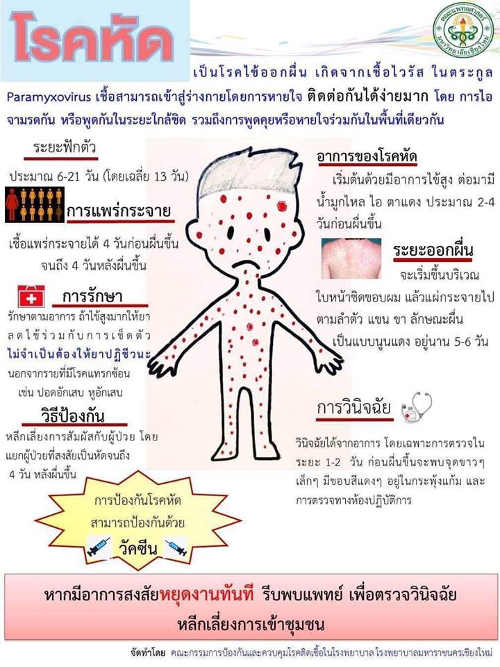 อาการของโรคหัด เริ่มต้นด้วยไข้สูง น้ำมูกไหล ไอ ตาแดง ประมาณ 2-3 วัน ผู้ป่วยบางรายอาจพบจุดขาวปนเทาขนาดเล็กอยู่บนฐานสีแดงบริเวณกระพุ้งแก้ม ซึ่งมักพบก่อนเริ่มมีผื่น ผื่นของโรคหัดจะเริ่มขึ้นจากศีรษะลงไปที่เท้ากล่าวคือ จะเริ่มขึ้นบริเวณไรผม ใบหน้า แล้วลามไปยังหู คอ แล้วกระจายไปตามลำตัว แขน ขา ลักษณะผื่นเป็นแบบนูนแดง อยู่นานประมาณ 5-6 วัน แล้วหายได้เอง โรคหัดเป็นโรคที่สามารถป้องกันได้ด้วยวัคซีน ซึ่งตามแผนงานสร้างเสริมภูมิคุ้มกันโรคของกระทรวงสาธารณสุข จะฉีดวัคซีนรวมป้องกันโรคหัด-คางทูม-หัดเยอรมัน เข็มแรกเมื่อเด็กอายุ 9 เดือน และเข็มที่สองเมื่ออายุ 2-2.5 ปี สำหรับผู้ใหญ่ที่ไม่แน่ใจว่าตนเองมีภูมิคุ้มกันโรคหัดหรือไม่ มีข้อสังเกต 3 ข้อหลัก ได้แก่ 1. เคยเป็นโรคหัดแล้ว โดยมีหลักฐานทางการแพทย์ยืนยัน 2. เคยได้รับวัคซีนป้องกันโรคหัดครบ 2 เข็ม 3. เคยเจาะดูภูมิคุ้มกันต่อโรคหัดพบว่ามีภูมิในระดับที่สามารถป้องกันโรคได้ หากไม่มีทั้งหมดที่กล่าวมา แนะนำให้ไปรับวัคซีนเพื่อป้องกันโรคหัดต่อไป
