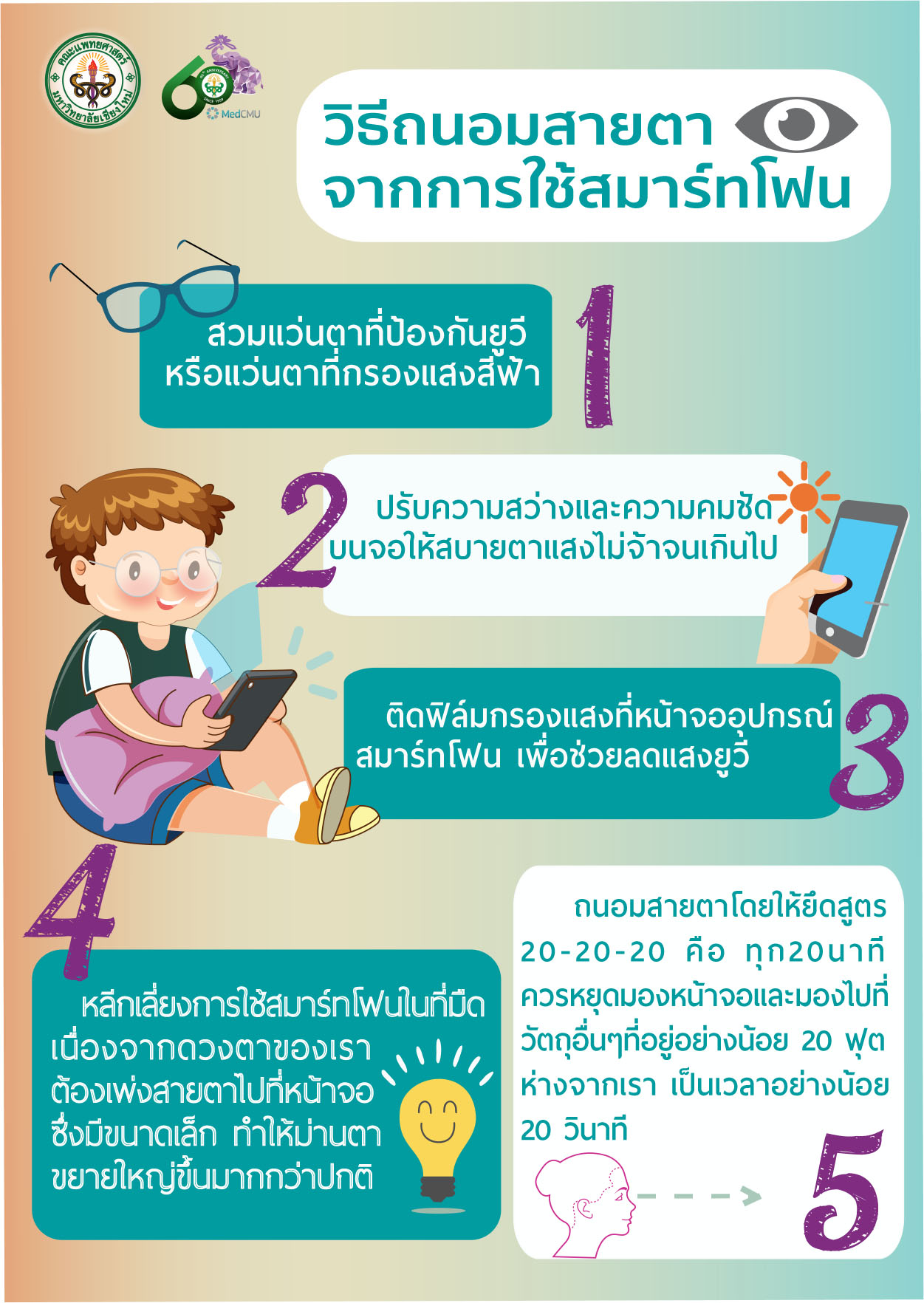“ยึดสูตร 20-20-20 คือทุก 20 นาที เราควรหยุดมองหน้าจอดิจิตอล และมองไปที่วัตถุอื่นๆที่อยู่อย่างน้อย 20 ฟุต (6 เมตร) ห่างจากเรา เป็นเวลาอย่างน้อย 20 วินาที เพื่อพักผ่อนสายตาไม้ให้ล้าจนเกินไป”
