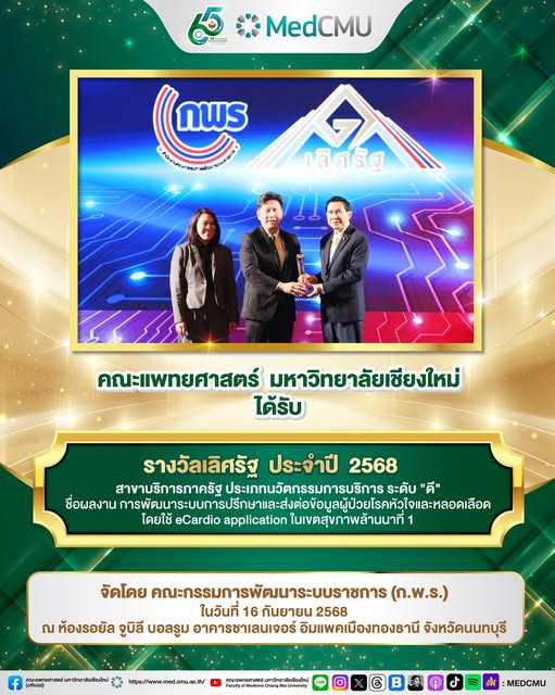 ศ.นพ.ณัฐพงศ์ โฆษชุณหนันท์ รองคณบดีด้านบริหารทั่วไป คณะแพทยศาสตร์ มหาวิทยาลัยเชียงใหม่ และพว.จุฬาลักษณ์ เอกสุวรรณ พยาบาลวิชาชีพ สังกัดหน่วยตรวจสวนหัวใจและหลอดเลือด ภาควิชาอายุรศาสตร์ คณะแพทยศาสตร์ มช. เข้าร่วมพิธีมอบรางวัลรัฐ ประจำปี 2568 ภายใต้แนวคิด “ภาครัฐของจริง ขับเคลื่อนอนาคต (Smart Government & Smart Services: Driving for the Future)” โดยได้รับรางวัลสาขาบริการภาครัฐ ประเภทนวัตกรรมการบริการ ระดับ “ดี” ชื่อผลงาน การพัฒนาระบบการปรึกษาและส่งต่อข้อมูลผู้ป่วยโรคหัวใจและหลอดเลือดโดยใช้ eCardio application ในเขตสุขภาพล้านนาที่ 1 จัดโดย คณะกรรมการพัฒนาระบบราชการ (ก.พ.ร.) เมื่อวันที่ 16 กันยายน 2568 ณ ห้องรอยัล จูบิลี บอลรูม อาคารชาเลนเจอร์ อิมแพคเมืองทองธานี จังหวัดนนทบุรี