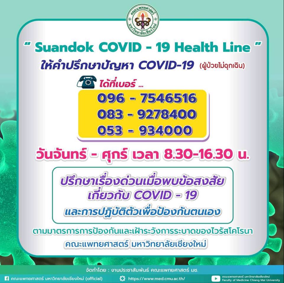 หากมีคำถาม หรือข้อสงสัยเกี่ยวกับโควิด-19 ทางโรงพยาบาลมหาราชนครเชียงใหม่ มีบริการ“ Suandok COVID-19 Health Line” เป็นสายบริการสุขภาพ ตอบทุกคำถามเกี่ยวกับ COVID-19 เป็นคำแนะนำสำหรับผู้ป่วยไม่ฉุกเฉิน มีอาการไม่รุนแรง หรือไม่มีอาการ โทร.096-7546516 083-9278400 และ053-934000 ให้คำปรึกษา ระหว่างเวลา 08.00-16.00 น.