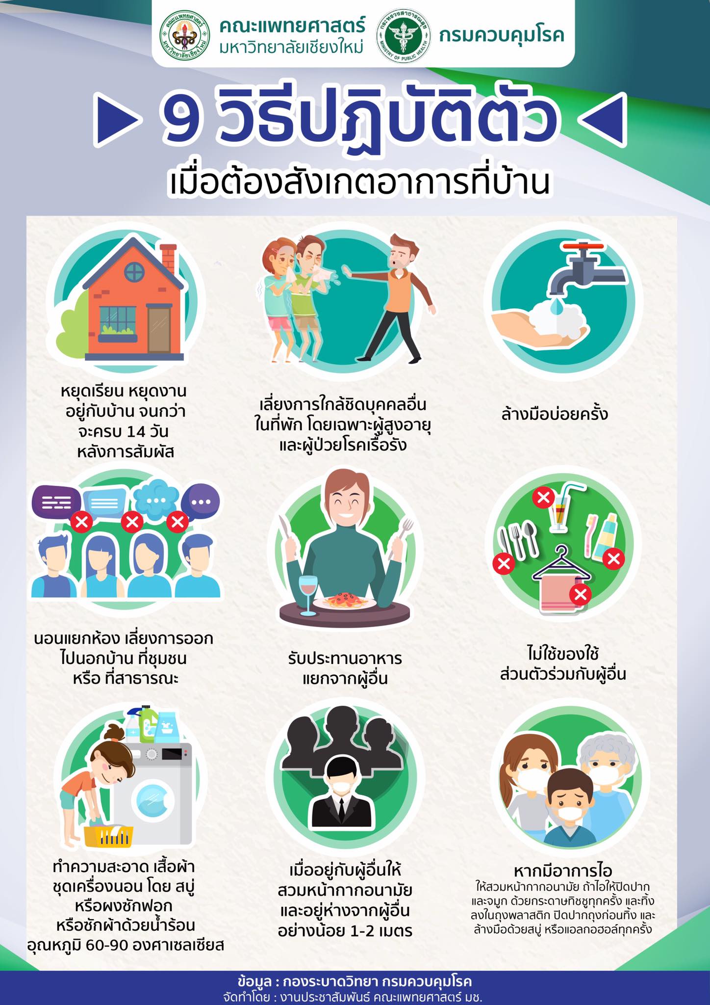 อ.พญ.ขวัญหทัย แก้วปู่วัด อาจารย์ประจำหน่วยโรคติดเชื้อและเวชศาสตร์เขตร้อน ภาควิชาอายุรศาสตร์ คณะแพทยศาสตร์ มช. ให้คำแนะนำว่า การแยกกักตัวเองอยู่ที่บ้าน คือการลดโอกาสที่เราแพร่เชื้อไปสู่บุคคลอื่น ก่อนที่เราจะมีอาการ หรือมีเพียงแค่ความเสี่ยง คือผู้ป่วยส่วนหนึ่งมีความเสี่ยงมาก่อน จะมีช่วงระยะเวลาที่ผู้ป่วยไม่แสดงอาการที่แพร่เชื้อได้ เพราะฉะนั้น คนกลุ่มนี้จะต้องแยกกักเพื่อรอดูอาการของตัวเอง ไม่ให้แพร่เชื้อออกไป