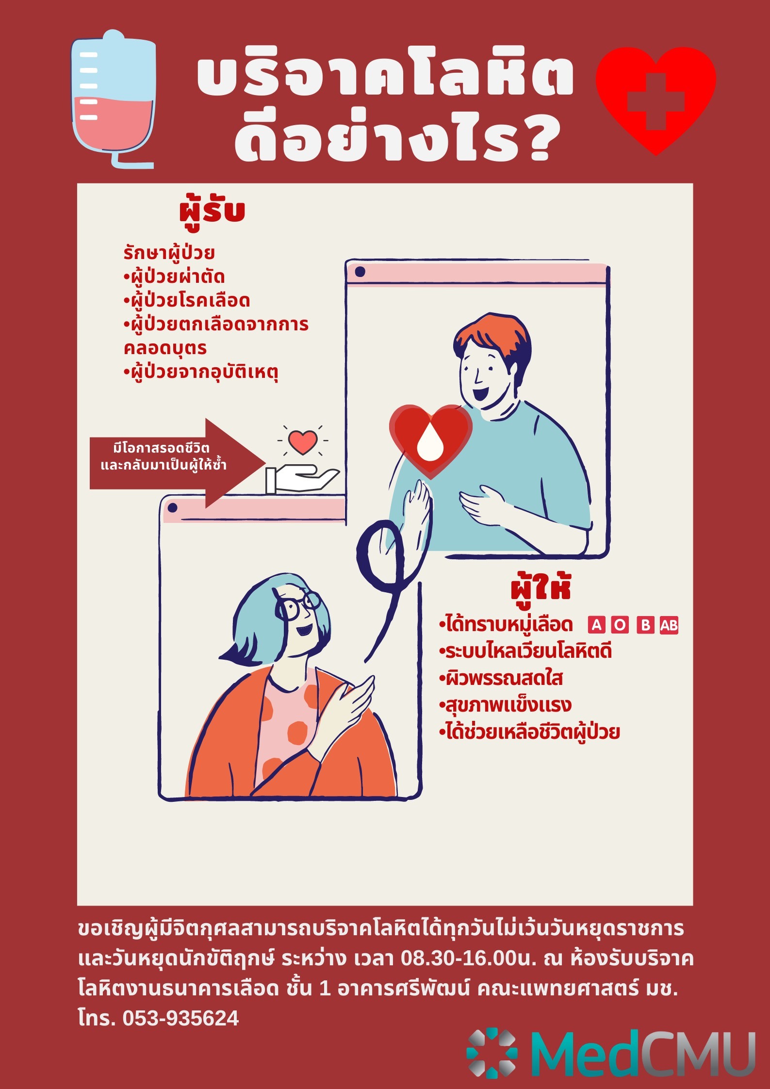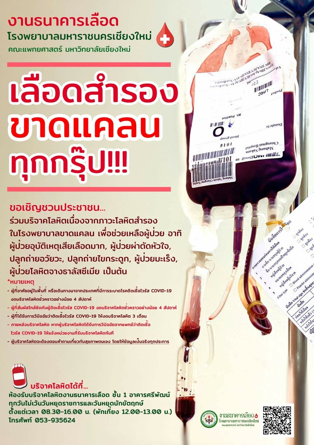 จากสถานการณ์การระบาดของโรคโควิด-19 ที่เกิดขึ้นอย่างต่อเนื่อง ทำให้จำนวนผู้มาบริจาคโลหิตลดลงจากเดิม โรงพยาบาลมหาราชนครเชียงใหม่ ขาดแคลนโลหิตสำรองทุกกรุ๊ป จึงขอเชิญชวนผู้มีจิตกุศลร่วมช่วยกันบริจาคโลหิต เพื่อช่วยเหลือผู้ป่วยที่เข้ารับการรักษา ซึ่งขณะนี้มีผู้ป่วยหลายรายที่รอคอยความเมตตาจากท่านด้วยความหวังที่จะหายจากโรคที่เป็นอยู่ โรงพยาบาลมหาราชนครเชียงใหม่เน้นย้ำเรื่องมาตรการสร้างความมั่นใจให้เป็นสถานที่สะอาดปลอดภัยจากโควิด-19