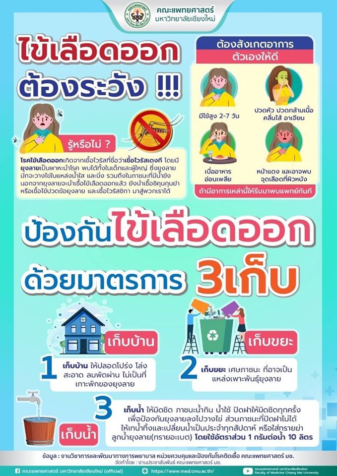ประเทศไทยพบผู้ป่วยไข้เลือดออกแล้วกว่า 1.6 หมื่นราย เสียชีวิต 11 ราย แพทย์เตือนประชาชนทั่วประเทศเฝ้าระวังโรคไข้เลือดออกระบาดหนักช่วงหน้าฝน ย้ำป้องกันตนเองไม่ให้ยุงกัด กำจัดลูกน้ำยุงลาย ใช้มาตรการควบคุมโรค 3-3-1 และ3 เก็บ 3 โรค หากมีไข้สูงเฉียบพลันให้รีบพบแพทย์ทันที