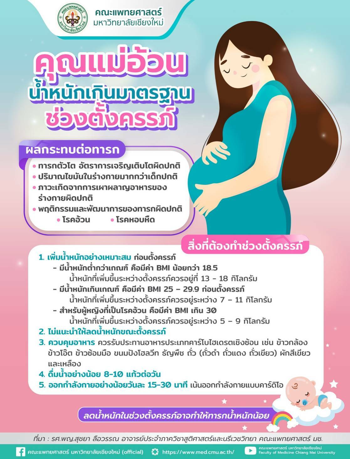 รศ.พญ.สุชยา ลือวรรณ อาจารย์ประจำภาควิชาสูติศาสตร์และนรีเวชวิทยา คณะแพทยศาสตร์ มช. กล่าวว่า “การเตรียมความพร้อมด้านร่างกายของคุณแม่นั้นเป็นเรื่องที่สำคัญ โดยเฉพาะเรื่องของน้ำหนักตัวที่เกินมาตรฐาน หรือ โรคอ้วน ซึ่งสามารถหาค่าตามดัชนีมวลกาย (Body Mass Index : BMI) สำหรับคนอ้วนจะมีปัญหามีบุตรยากมากกว่าคนทั่วไป 3 เท่า และเมื่อตั้งครรภ์แล้วอาจมีภาวะแทรกซ้อนระหว่างตั้งครรภ์ตามมา แต่หากยังไม่ตั้งครรภ์แนะนำให้ปรับเปลี่ยนพฤติกรรม ดูแลเรื่องอาหาร ออกกำลังกาย และเข้ารับคำปรึกษาจากแพทย์ผู้เชี่ยวชาญเพื่อตรวจหาโรคเบาหวาน และ ต่อมธัยรอยด์ นอกจากนี้เมื่อพบว่ามีน้ำหนักสูงเกินมาตรฐาน ควรตั้งเป้าหมายหากลดน้ำหนักลง 10 เปอร์เซ็นต์ก่อนตั้งครรภ์ จะช่วยลดภาวะแทรกซ้อนต่างๆได้ รวมถึงการเตรียตัวโดยการใช้วิตามินช่วย เสริมกรดโฟลิคเตรียมพร้อมก่อนตั้งครรภ์ เพราะช่วยในการสร้างตัวอ่อน ป้องกันภาวะผิดปกติของเด็ก ช่วยลดความเสี่ยงในการเกิดความพิการบางอย่างได้