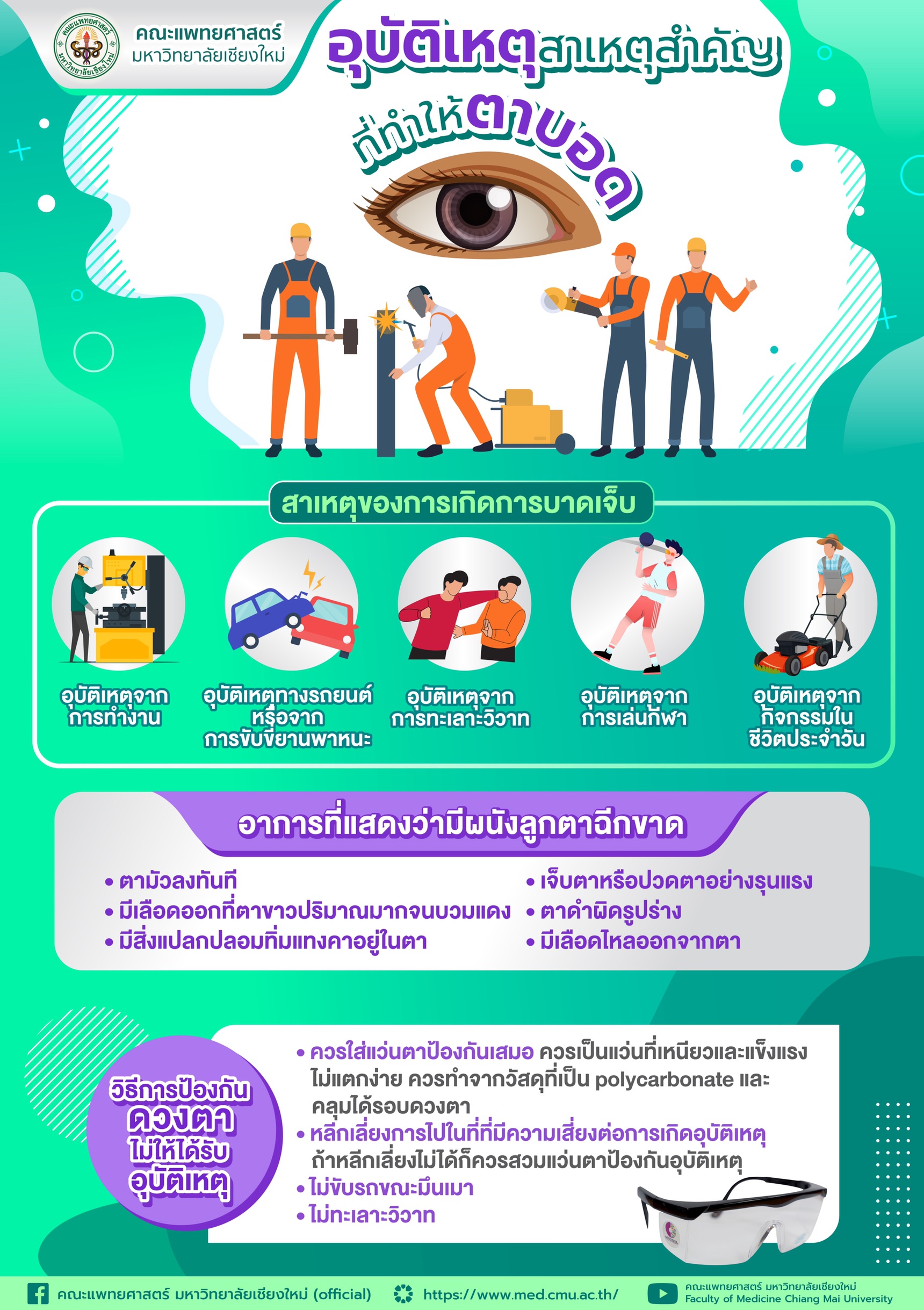 “อุบัติเหตุ” ใคร ๆ ก็ไม่อยากให้เกิดกับตัวเอง หรือลูกหลานญาติพี่น้อง เพราะคำว่า “อุบัติเหตุ” ฟังแล้วชวนให้หดหู่ใจ ยิ่งเป็นอุบัติเหตุทางตาอาจทำให้สูญเสียการมองเห็นหรือตาบอดได้เลยทีเดียว อุบัติเหตุกับดวงตาจัดเป็นสาเหตุสำคัญของการเกิดภาวะ“ตาบอด”ที่ป้องกันได้ในทั่วโลก โดยเฉพาะอย่างยิ่งในประเทศกำลังพัฒนาเมื่อมีการบาดเจ็บต่อดวงตาจะส่งผลกระทบทั้งทางจิตใจและเศรษฐานะของทั้งตัวผู้ป่วยและครอบครัว เพราะต้องขาดเรียน ขาดงาน ขาดรายได้ หากตาบอดอาจต้องเสียงาน และยังมีค่าใช้จ่ายเพิ่มเติมในการดูแลรักษาเป็นระยะเวลานานอีกด้วย