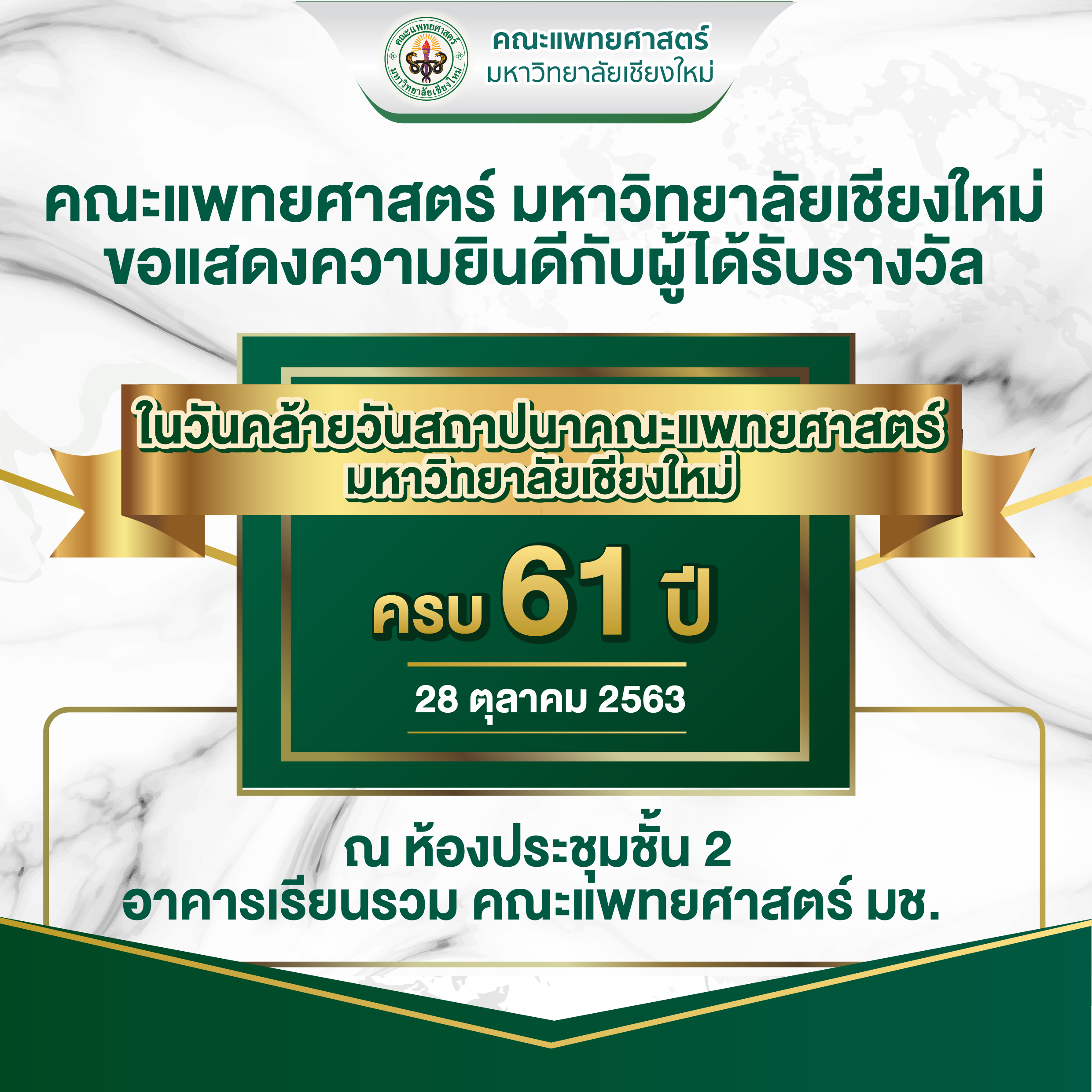 คณะแพทยศาสตร์ มหาวิทยาลัยเชียงใหม่ ขอแสดงความยินดีกับผู้ได้รับรางวัล ในโอกาสวันคล้ายวันสถาปนาคณะแพทยศาสตร์ มช. ครบ 61 ปี
