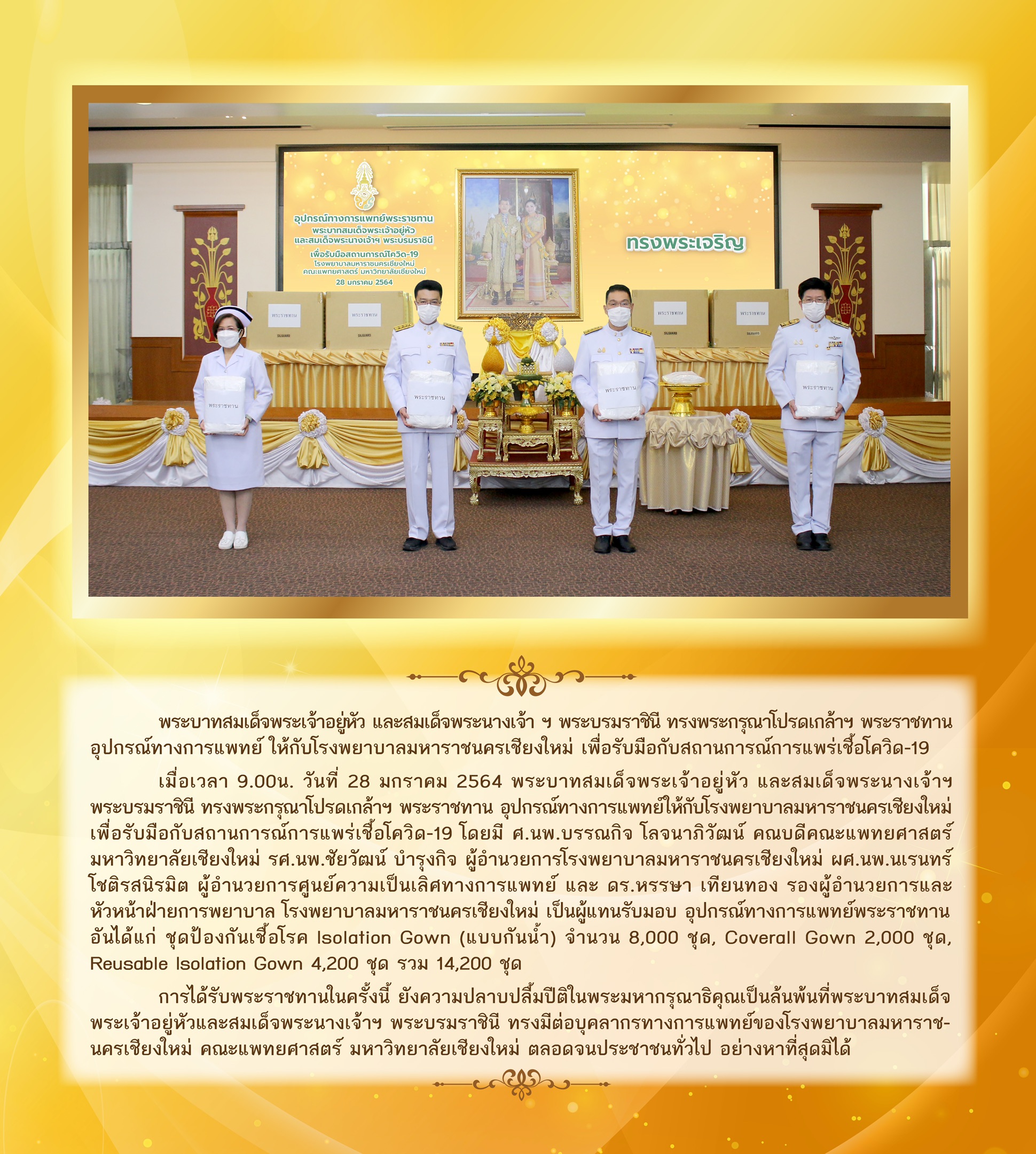 เมื่อเวลา 9.00น. วันที่ 28 มกราคม 2564 พระบาทสมเด็จพระเจ้าอยู่หัว และสมเด็จพระนางเจ้า ฯ พระบรมราชินี ทรงพระกรุณาโปรดเกล้าฯ พระราชทาน อุปกรณ์ทางการแพทย์ให้กับโรงพยาบาลมหาราชนครเชียงใหม่ เพื่อรับมือกับสถานการณ์การแพร่เชื้อโควิด-19 โดยมี ศ.นพ.บรรณกิจ โลจนาภิวัฒน์ คณบดีคณะแพทยศาสตร์ มหาวิทยาลัยเชียงใหม่ รศ.นพ.ชัยวัฒน์ บำรุงกิจ ผู้อำนวยการโรงพยาบาลมหาราชนครเชียงใหม่ ผศ.นพ.นเรนทร์ โชติรสนิรมิต ผู้อำนวยการศูนย์ความเป็นเลิศทางการแพทย์ และ ดร.หรรษา เทียนทอง รองผู้อำนวยการและหัวหน้าฝ่ายการพยาบาล โรงพยาบาลมหาราชนครเชียงใหม่ เป็นผู้แทนรับมอบ อุปกรณ์ทางการแพทย์พระราชทาน อันได้แก่ ชุดป้องกันเชื้อโรค Isolation Gown (แบบกันน้ำ) จำนวน 8,000 ชุด , Coverall Gown 2,000 ชุด , Reusable Isolation Gown 4,200 ชุด รวม 14,200 ชุด