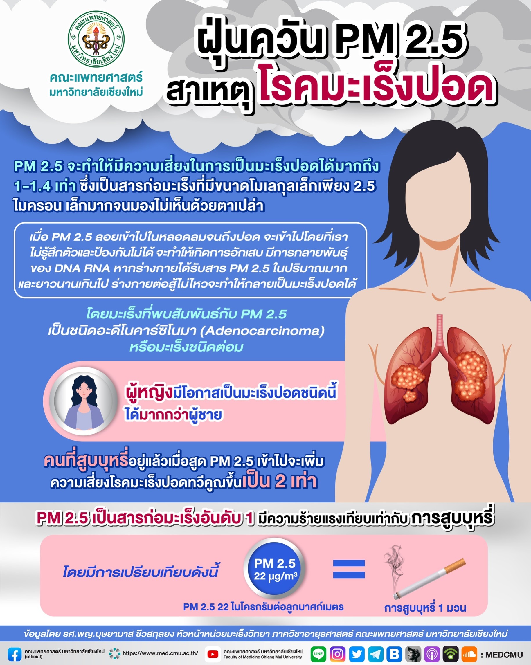 ปัจจัยเหล่านี้เพิ่มความเสี่ยงประมาณ 2.5 เท่า หากเราไม่มีความเสี่ยงอะไรแต่เราอยู่ในสภาวะที่มี PM2.5 จะทำให้มีความเสี่ยงในการเป็นมะเร็งปอดได้มากถึง 1-1.4 เท่า ซึ่ง PM2.5 เป็นสารก่อมะเร็งที่มีขนาดโมเลกุลเล็กเพียง 2.5 ไมครอน เล็กมากจนมองไม่เห็นด้วยตาเปล่า ดังนั้นเมื่อ PM2.5 ลอยเข้าไปในหลอดลมจนถึงปอด จะเข้าไปโดยที่เราไม่รู้สึกตัวและป้องกันไม่ได้ เมื่อเข้าไปในปอดแล้วก็จะทำให้เกิดการอักเสบ มีการกลายพันธุ์ของ DNA RNA หากร่างกายได้รับสาร PM2.5 ในปริมาณมากและยาวนานเกินไป ร่างกายต่อสู้ไม่ไหวจะทำให้กลายเป็นมะเร็งปอดได้ โดยมะเร็งที่พบสัมพันธ์กับ PM2.5 ก็คือเป็นชนิดอะดีโนคาร์ซิโนมา (Adenocarcinoma) หรือมะเร็งชนิดต่อม ซึ่งผู้หญิงมีโอกาสเป็นมะเร็งปอดชนิดนี้ได้มากกว่าผู้ชาย ส่วนคนที่สูบบุหรี่อยู่แล้วเมื่อสูด PM2.5 เข้าไปจะเพิ่มความเสี่ยงโรคมะเร็งปอดจะทวีคูณขึ้นเป็น 2 เท่า