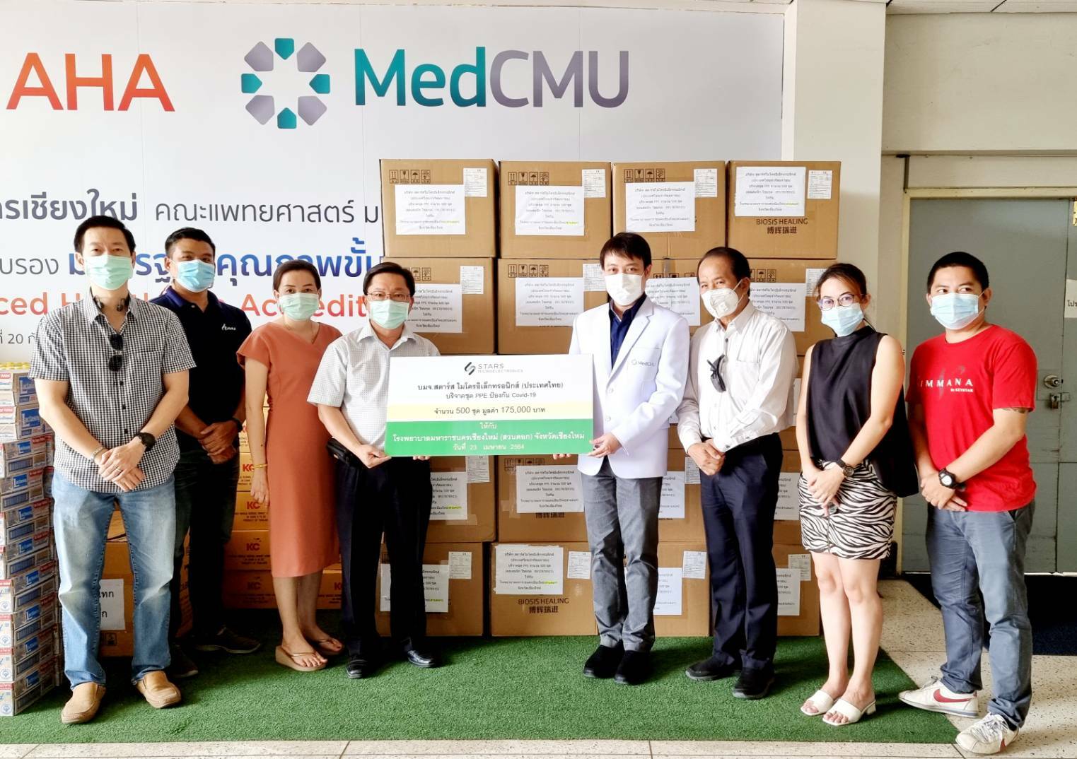 บมจ.สตาร์ส ไมโครอิเล็คทรอนิกส์ (ประเทศไทย) บริจาคชุดPPE จำนวน 500 ชุด มูลค่า 175,000 บาท ให้แก่ทีมแพทย์ , บุคลากร และบุคลากรที่ปฏิบัติหน้าที่ในสถานการณ์ COVID-19 ของโรงพยาบาลมหาราชนครเชียงใหม่ โดยมี รศ.นพ.เศรษฐพงศ์ บุญศรี รองผู้อำนวยการโรงพยาบาลมหาราชนครเชียงใหม่ รับมอบ เมื่อวันที่ 23 เมษายน 2564 ณ บริเวณโถงชั้น 1 อาคารบุญสม มาร์ติน คณะแพทยศาสตร์ มช.