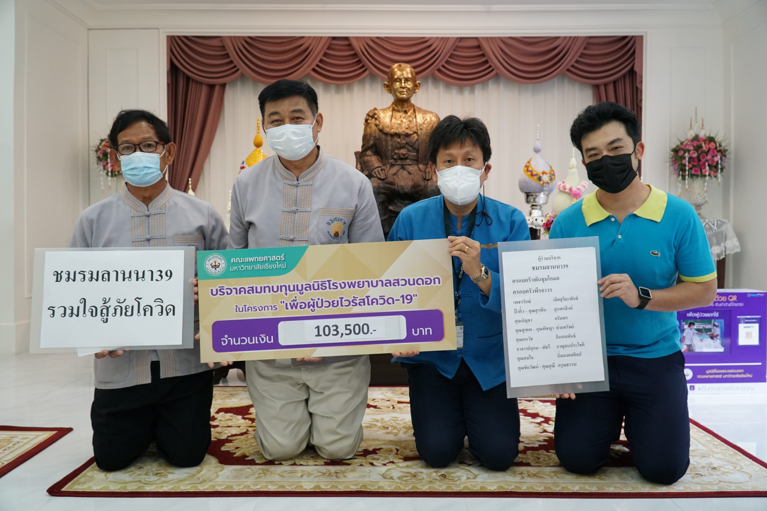 ชมรมลานนา 39, ครอบครัวพันธุมโกมล, ครอบครัวพีรถาวร, คุณเพชรรักษ์ เลิศสุริยะพันธ์, ป้าติ๋ว – คุณสุรพิน สุนทรสิงห์, คุณบัญชา จรัมพร, คุณสุเทพ – คุณพิชชา ต่านทรัพย์, คุณอนวัช อินสมพันธ์, อาจารย์อุดม – พัชรี กาญจนประโชติ, คุณสมใจ นิ่มมงคลศิลป และคุณชัยวัฒน์ – คุณสุณี ดรุณธรรม บริจาคเงินจำนวน 103,500 บาท สมทบทุนมูลนิธิโรงพยาบาลสวนดอก เพื่อผู้ป่วยไวรัส โควิด -19 โดยมี รศ.นพ.ณัฐพงศ์ โฆษชุณหนันท์ รองคณบดีคณะแพทยศาสตร์ มช. รับมอบ เมื่อวันที่ 30 เมษายน 2564 ณ ศาลาใต้ร่มพระบารมี ชั้น 1 อาคารสุจิณโณ คณะแพทยศาสตร์ มช.