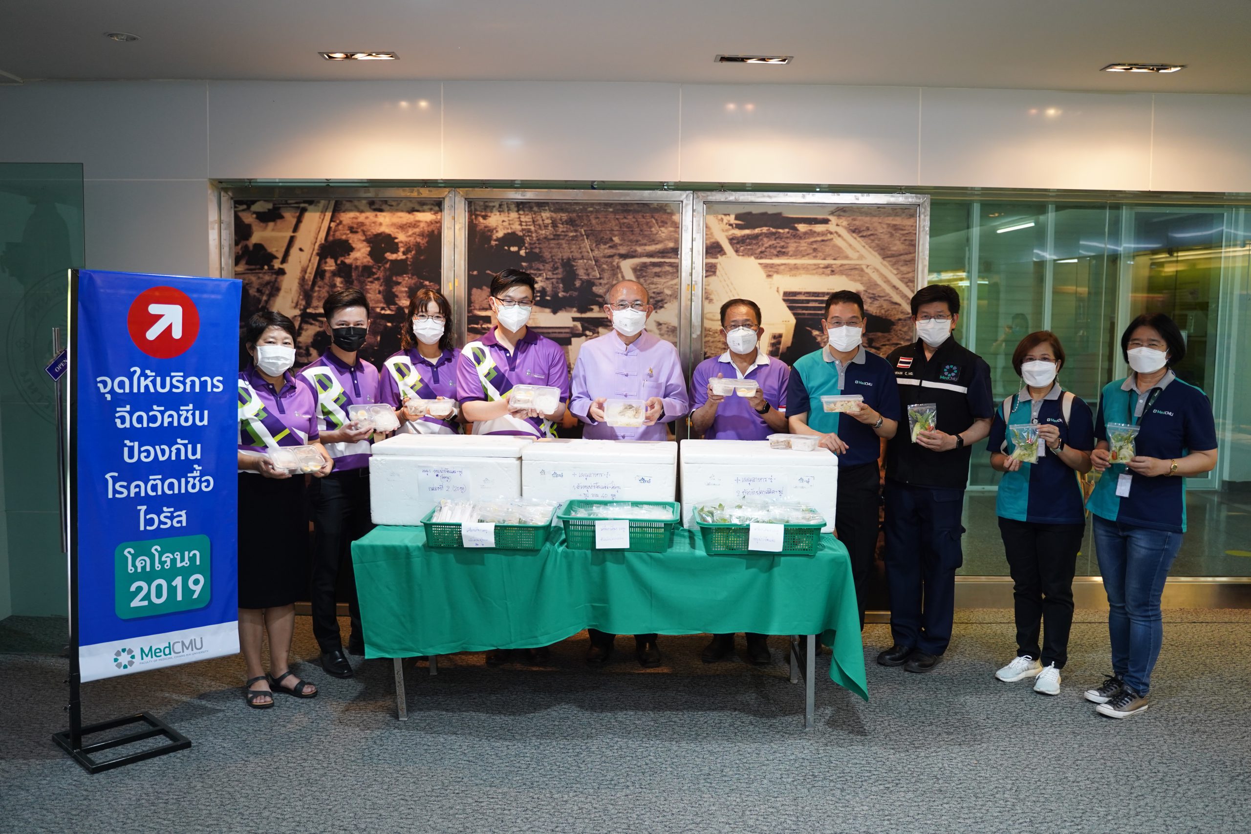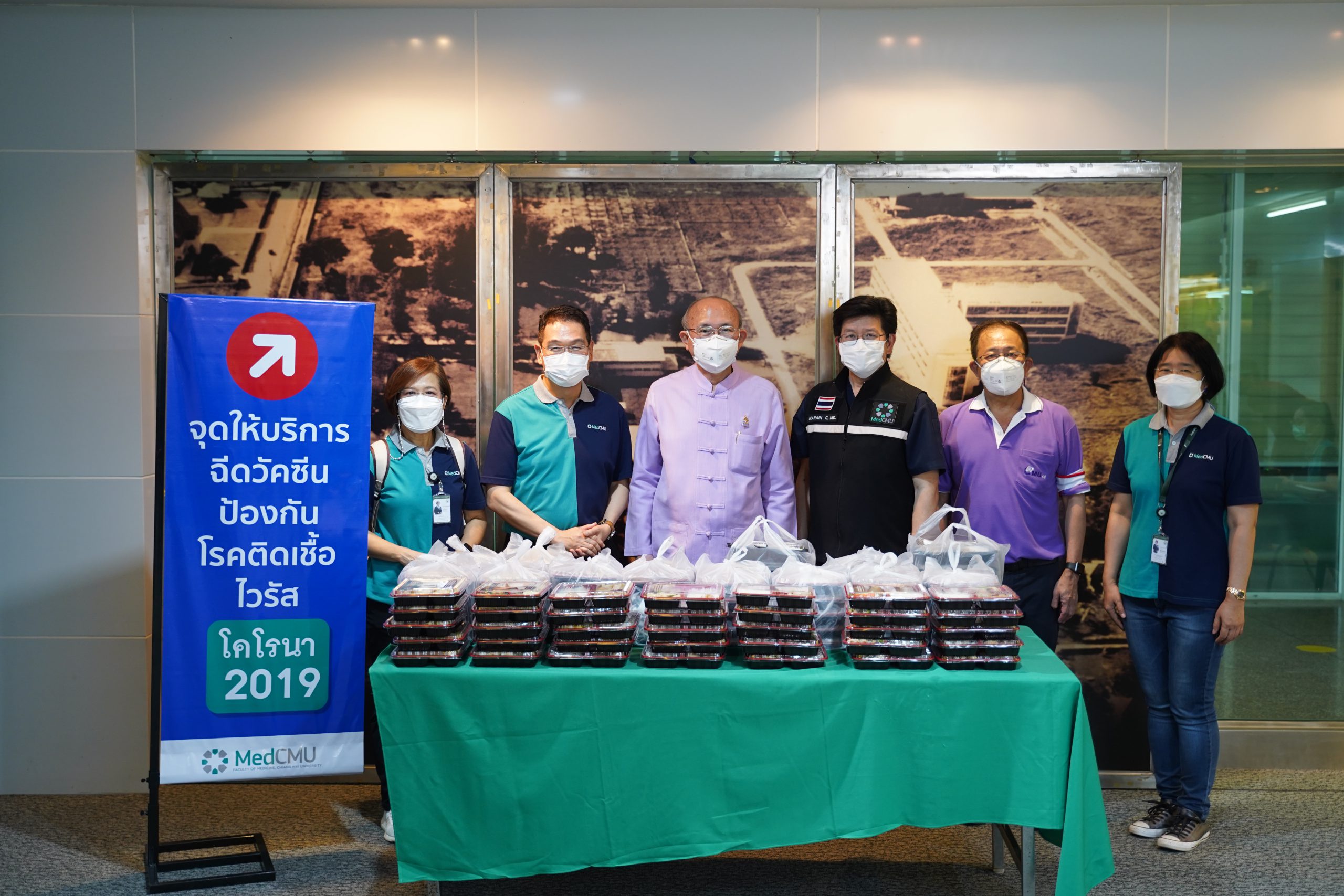 ศ.คลินิก นพ.นิเวศน์ นันทจิต อธิการบดีมหาวิทยาลัยเชียงใหม่ และ รศ. ประเสริฐ ฤกษ์เกรียงไกร รองอธิการบดีฯ เป็นผู้แทน มช. มอบอาหารกล่อง จำนวน 100 กล่อง เพื่อเป็นกำลังใจแก่บุคลากรทางการแพทย์ จิตอาสาที่มาให้บริการฉีดวัคซีน covid-19 โรงพยาบาลมหาราชนครเชียงใหม่ คณะแพทยศาสตร์ มช. โดยมี ศ.(เชี่ยวชาญพิเศษ)นพ.บรรณกิจ โลจนาภิวัฒน์ คณบดีคณะแพทยศาสตร์ มช. และ ผศ.นพ.นเรนทร์ โชติรสนิรมิต ผู้อำนวยการโรงพยาบาลมหาราชนครเชียงใหม่ ร่วมรับมอบ เมื่อวันที่ 22 พฤษภาคม 2564 ณ ชั้น 1 อาคารเรียนรวม คณะแพทยศาสตร์ มช.