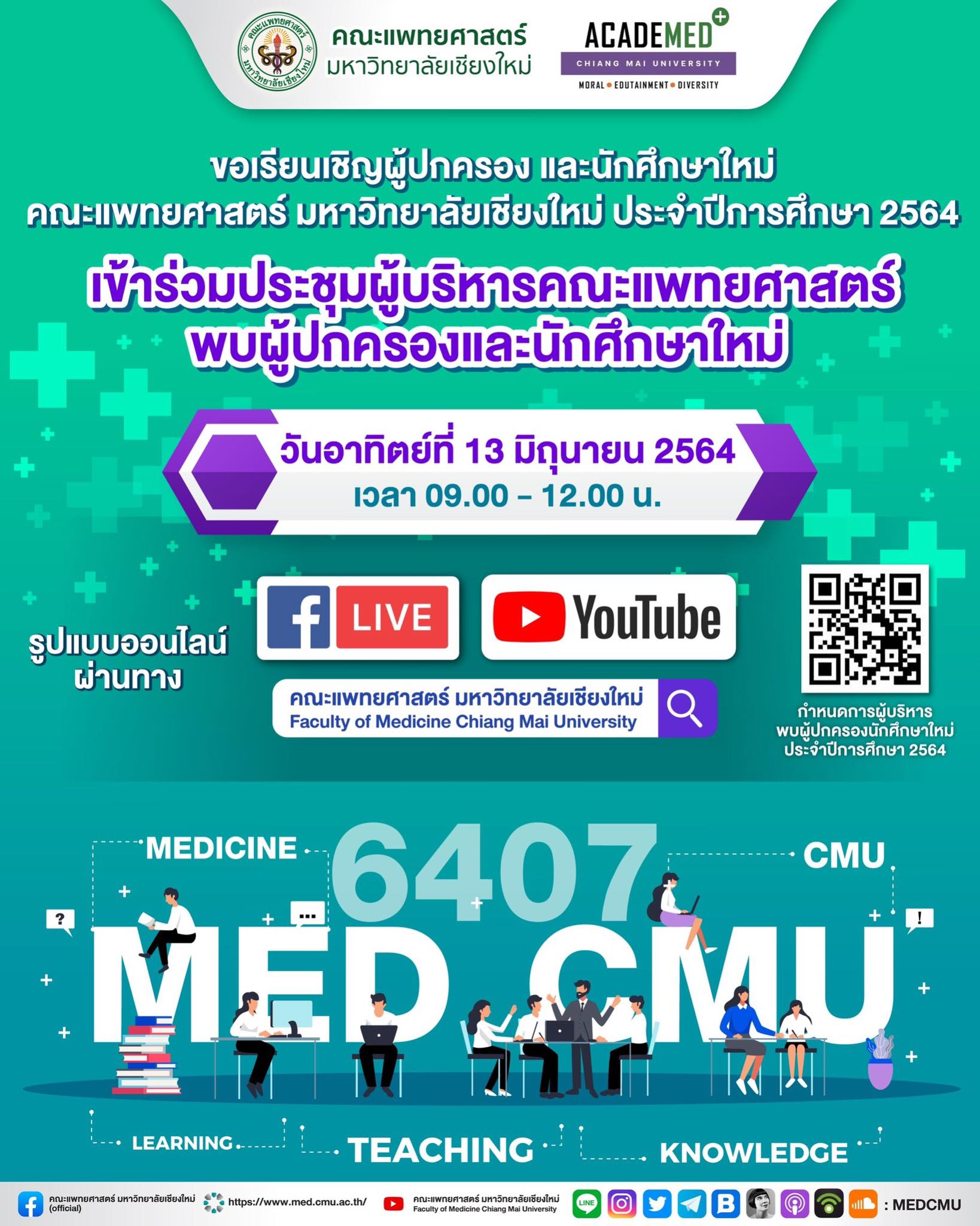 ขอเรียนเชิญผู้ปกครอง และนักศึกษาใหม่คณะแพทยศาสตร์ มหาวิทยาลัยเชียงใหม่ ประจำปีการศึกษา 2564 เข้าร่วมประชุมผู้บริหารคณะแพทยศาสตร์พบผู้ปกครองและนักศึกษาใหม่ ในวันอาทิตย์ ที่ 13 มิถุนายน 2564 เวลา 09.00 – 12.00 น. ในรูปแบบออนไลน์ ผ่านช่องทางดังนี้ – Facebook live คณะแพทยศาสตร์ มหาวิทยาลัยเชียงใหม่ : https://m.facebook.com/medcmuth/ – YouTube channel คณะแพทยศาสตร์ มหาวิทยาลัยเชียงใหม่ : https://youtube.com/channel/UCfTy3lgVupz8SJpw4Cc-EQw คณะแพทยศาสตร์ มหาวิทยาลัยเชียงใหม่ ยินดีต้อนรับนักศึกษาใหม่ ประจำปีการศึกษา 2564