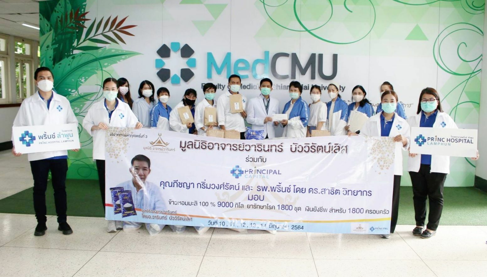 มูลนิธิอาจารย์วารินทร์ บัววิรัตน์เลิศ ร่วมกับคุณภีชญา กริ่มวงศ์รัตน์ และโรงพยาบาลพริ้นซ์ โดย ดร.สาธิต วิทยากร มอบข้าวสารและยารักษาโรค ให้แก่โรงพยาบาลมหาราชนครเชียงใหม่ คณะแพทยศาสตร์ มช. เพื่อใช้ในสถานการณ์ covid-19 โดยมี ผศ.นพ.สุรเชษฐ์ วงษ์นิ่ม ผู้ช่วยคณบดีคณะแพทยศาสตร์ มช. รับมอบ เมื่อวันที่ 10 มิถุนายน 2564 ณ บริเวณโถงชั้น 1 อาคารบุญสม มาร์ติน คณะแพทยศาสตร์ มช.