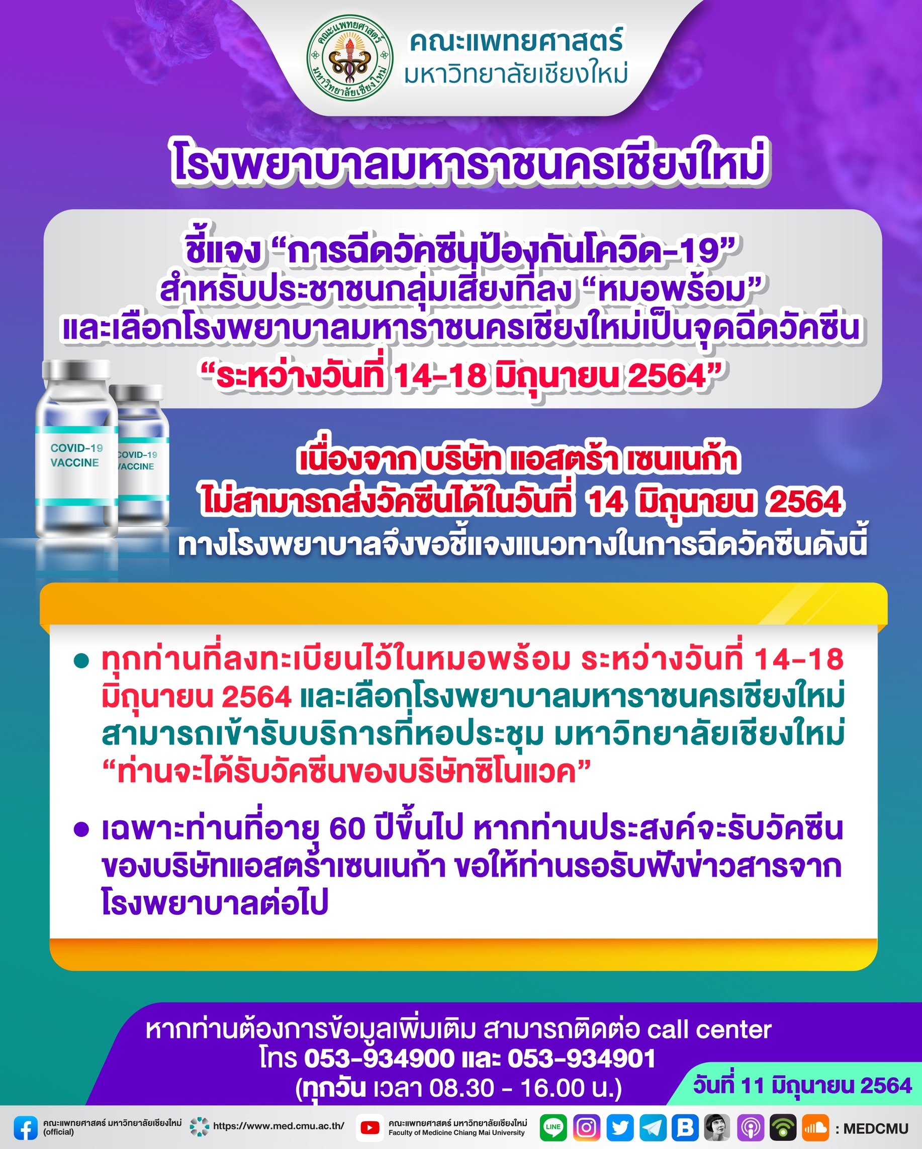 – ทุกท่านที่ลงทะเบียนไว้ในหมอพร้อม ระหว่างวันที่ 14-18 มิถุนายน 2564 และเลือกโรงพยาบาลมหาราชนครเชียงใหม่