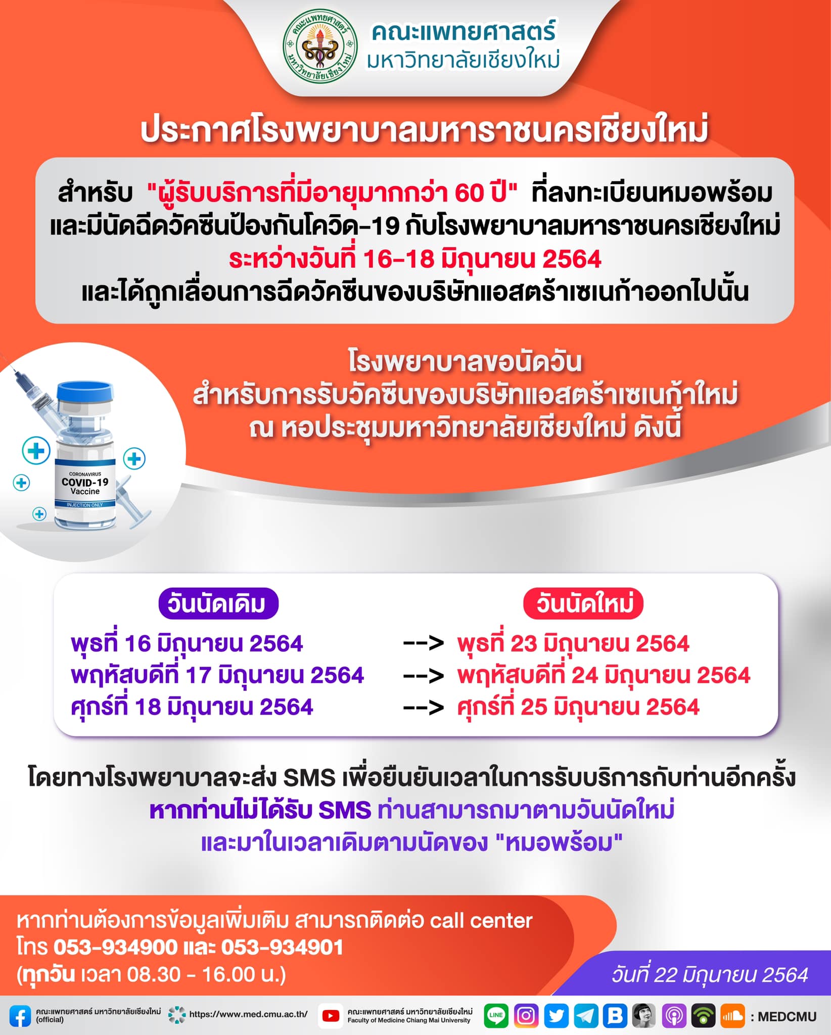 สำหรับ “ผู้รับบริการที่มีอายุมากกว่า 60 ปี” ที่ลงทะเบียนหมอพร้อม และมีนัดฉีดวัคซีนป้องกันโควิด-19 กับโรงพยาบาลมหาราชนครเชียงใหม่ ระหว่างวันที่ 16-18 มิถุนายน 2564 และได้ถูกเลื่อนการฉีดวัคซีนของบริษัทแอสตร้าเซเนก้าออกไปนั้น โรงพยาบาล ขอนัดวันสำหรับการรับวัคซีนของบริษัทแอสตร้าเซเนก้าใหม่ ณ หอประชุมมหาวิทยาลัยเชียงใหม่