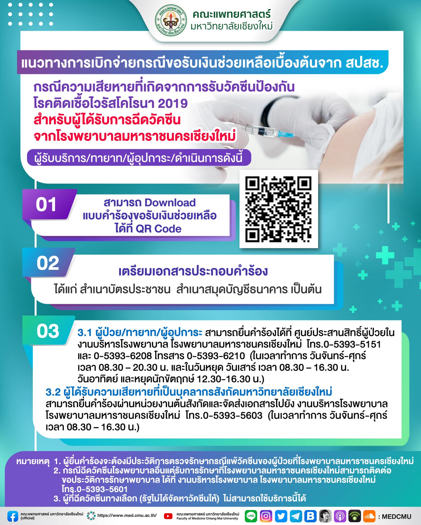 แนวทางการเบิกจ่ายกรณีขอรับเงินช่วยเหลือเบื้องต้นจาก สปสช. กรณีความเสียหายที่เกิดจากการรับวัคซีนป้องกันโรคติดเชื้อไวรัสโคโรนา 2019 สำหรับผู้ได้รับการฉีดวัคซีนจากโรงพยาบาลมหาราชนครเชียงใหม่ ผู้รับบริการ/ทายาท/ผู้อุปการะ/ดำเนินการดังนี้