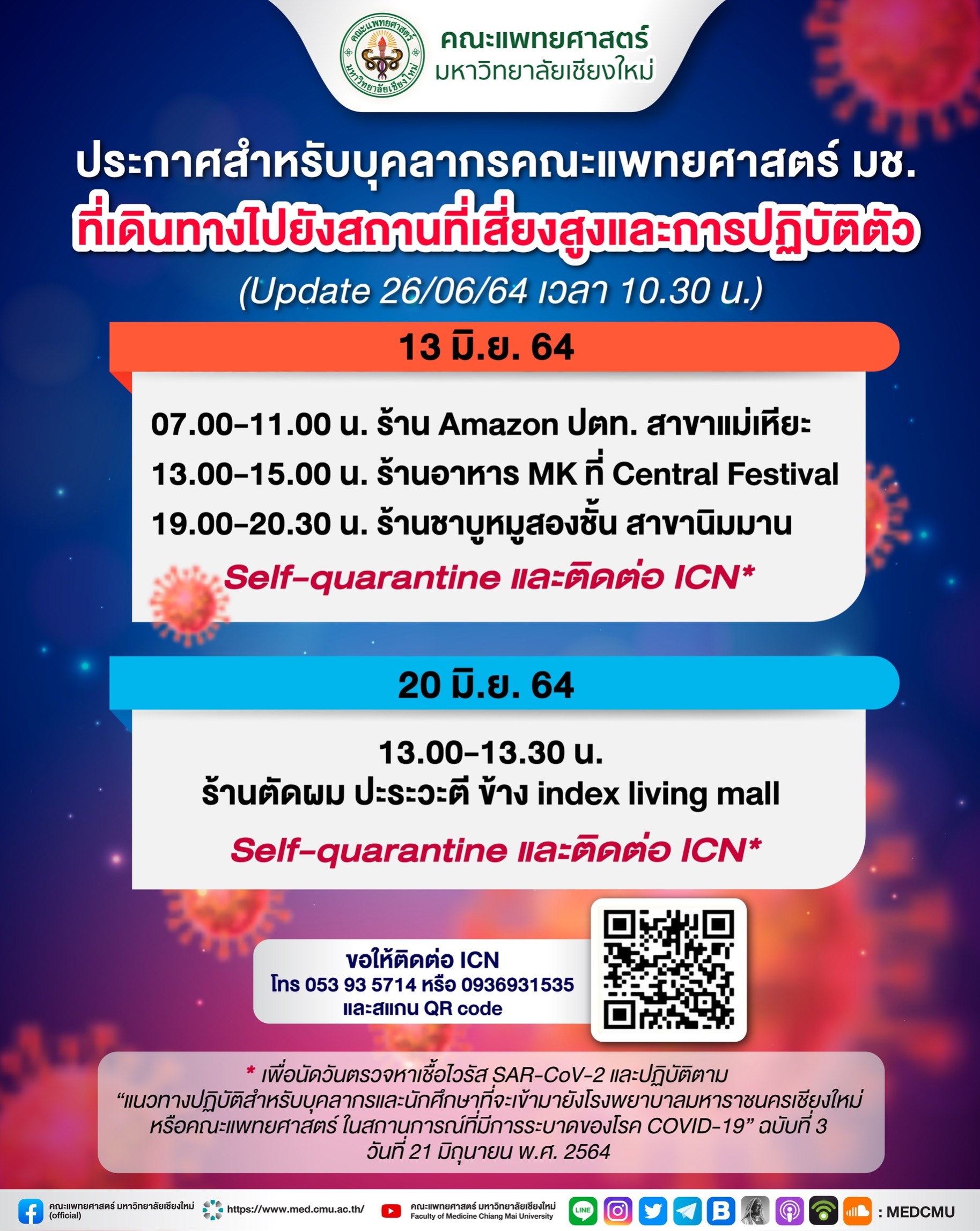 *เพื่อนัดวันตรวจหาเชื้อไวรัส SAR-CoV-2 และปฏิบัติตาม “แนวทางปฏิบัติสำหรับบุคลากรและนักศึกษาที่จะเข้ามายังโรงพยาบาลมหาราชนครเชียงใหม่ หรือคณะแพทยศาสตร์ ในสถานการณ์ที่มีการระบาดของโรค COVID-19” ฉบับที่ 3 วันที่ 21 มิถุนายน พ.ศ. 2564